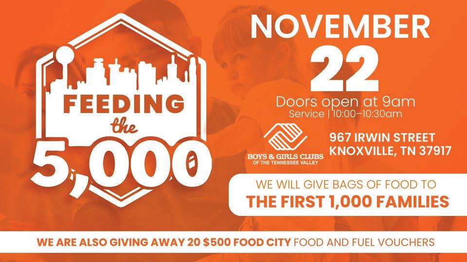 FEEDING THE 5,000: THANKSGIVING GIVEAWAY We’ll be giving away bags of food to the first 1,000 families. Each bag has everything you need for a full Thanksgiving meal that feeds five or more people. No registration necessary. This is a FREE event.