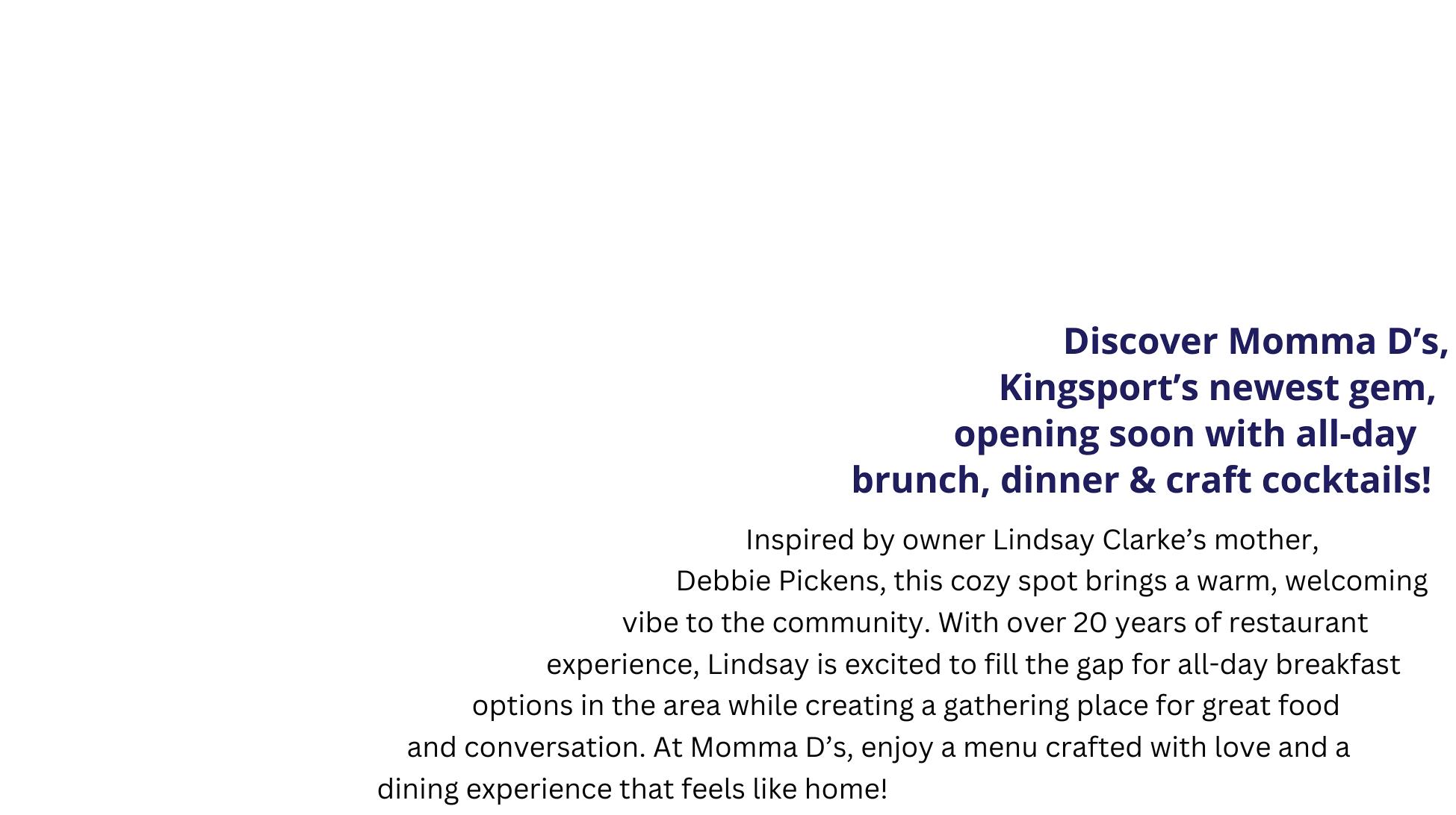 Nestled in the heart of Kingsport, Momma D’s is set to become the community’s newest destination for comforting meals and meaningful connections. Inspired by owner Lindsay Clarke’s mother, Debbie Pickens—affectionately known as “Momma D”— this cozy restaurant brings a warm, home-like atmosphere to the dining scene. Opening in April, Momma D’s offers all-day brunch, dinner, and craft cocktails, filling a much-needed gap in the area.