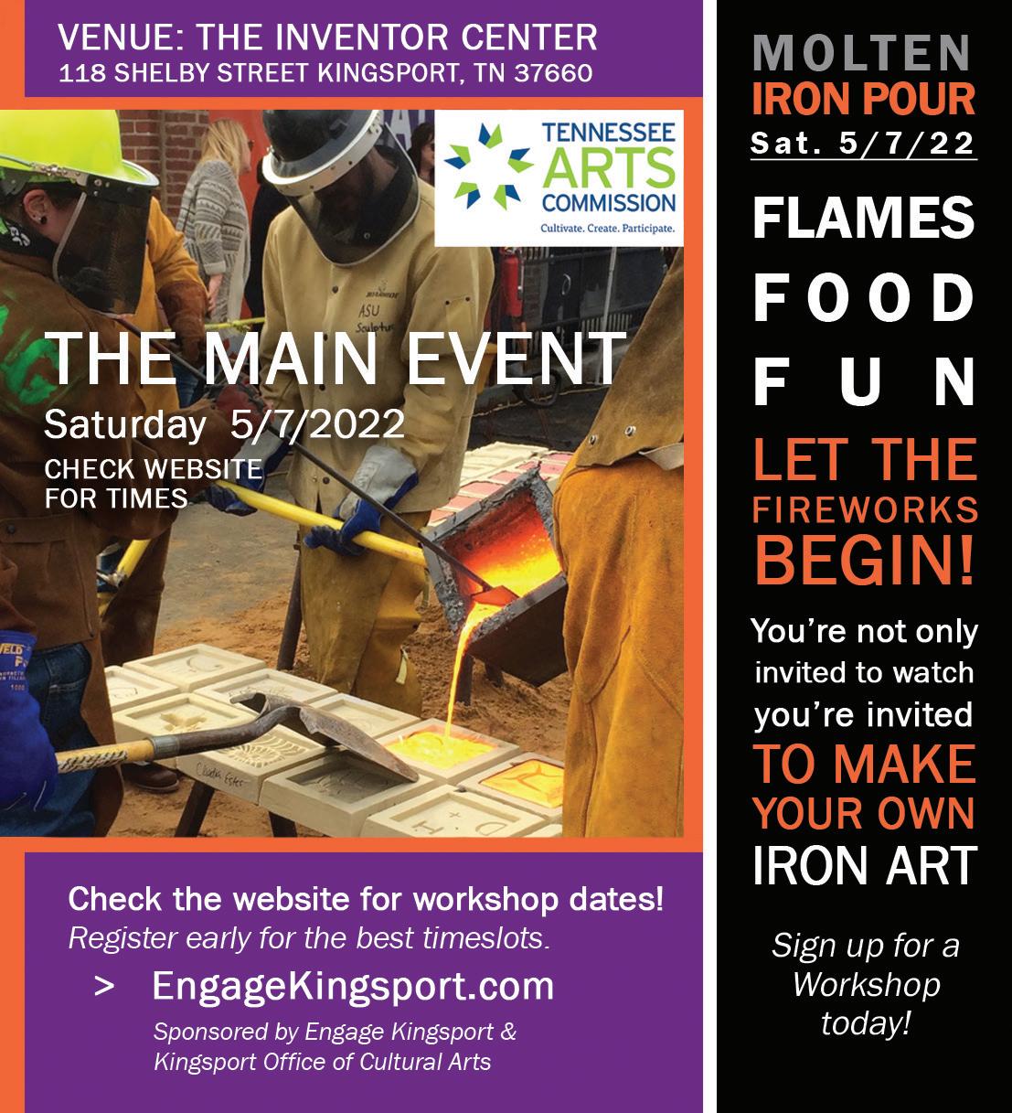 This Scratch Mold Workshop and Iron Pour is hosted by Engage Kingsport and the Kingsport Office of Cultural Arts at the Inventor Center located at 118 Shelby Street. These events are made possible by a grant from the Tennessee Arts Commission.