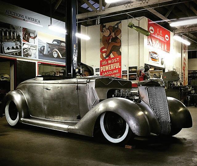 sightline. This body line was also added into the re-designed hood sides, to extend all the way to the grill. Original 36 headlights were used but shortened and relocated, as well as the 36 horn grills. The stock windshield stanchions were chopped and reshaped to add a few degrees of angle. The original roof irons were re-shaped to change the overall roof profile as well as operate with the chopped windshield.
