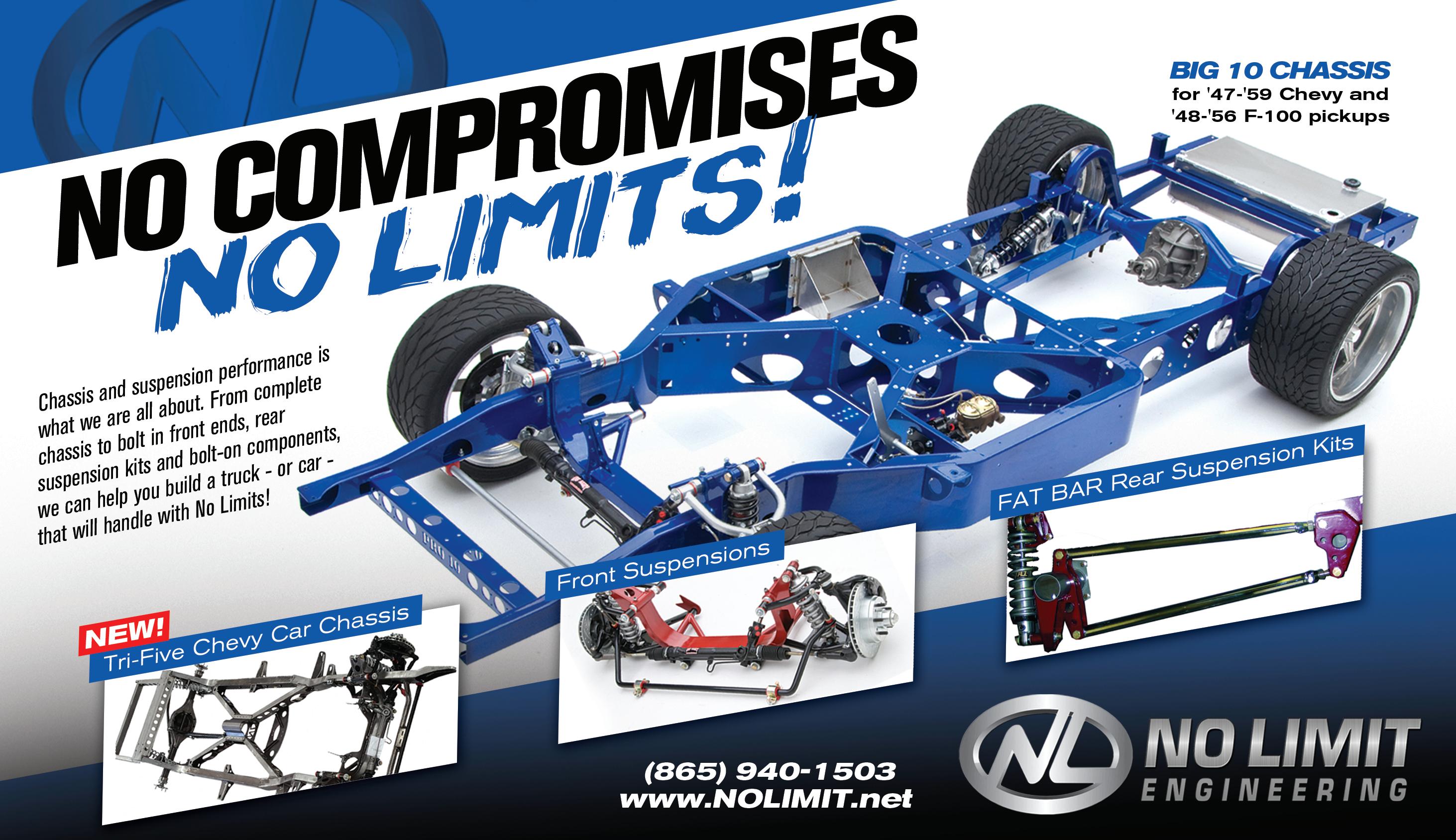 Custom bolt-in CNC formed Crossmember, Tubular Upper & Lower Control Arms with urathane bushings, No Limit ZG spindles, 12” drilled and slotted rotors with GM full size D52 calipers, Choice of 5 lug bolt pattern, Custom valved Ride Tech coilovers, Track Tested No Limit Sway Bar, Power Rack & Pinion, C-10 Wide Ride’s also include the new truss plate motor mounts that fit SBC, BBC, LSX. No Limit Engineering 865-940-1503 www.nolimit.net