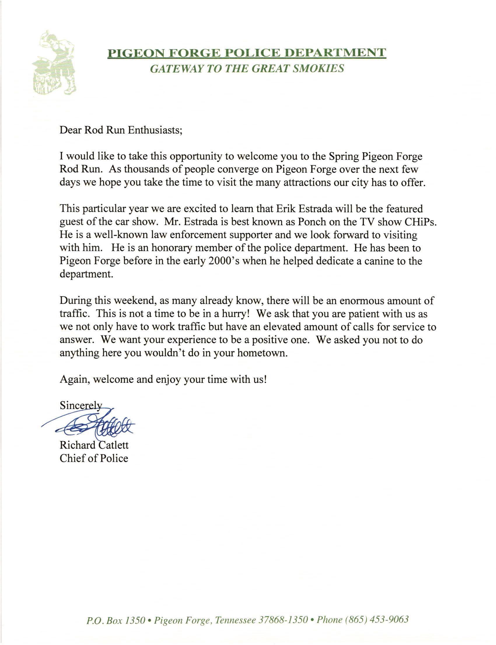 I would like to take this opportunity to welcome you to the Spring Pigeon Forge Rod Run. As thousands of people converge on Pigeon Forge over the next few days, we hope you take the time to visit the many attractions our city has to offer.