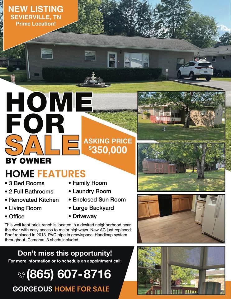 3BR/2BA BRICK RANCHER w/bonus room or office, laundry room, sunroof, sits on .36 acres w/2 sheds in back. New roof, handicap accessible home w/ ramp outside, large yard w/water feature, hardwood floors under carpet, all new kitchen cabinets, located in Sevierville inside City limits near French Broad River with easy commute to Pigeon Forge, Gatlinburg, Knoxville, etc.. & minutes from Hospital, schools, shopping, etc. Asking $350,000. For Sale By Owner: 865-607-8716
