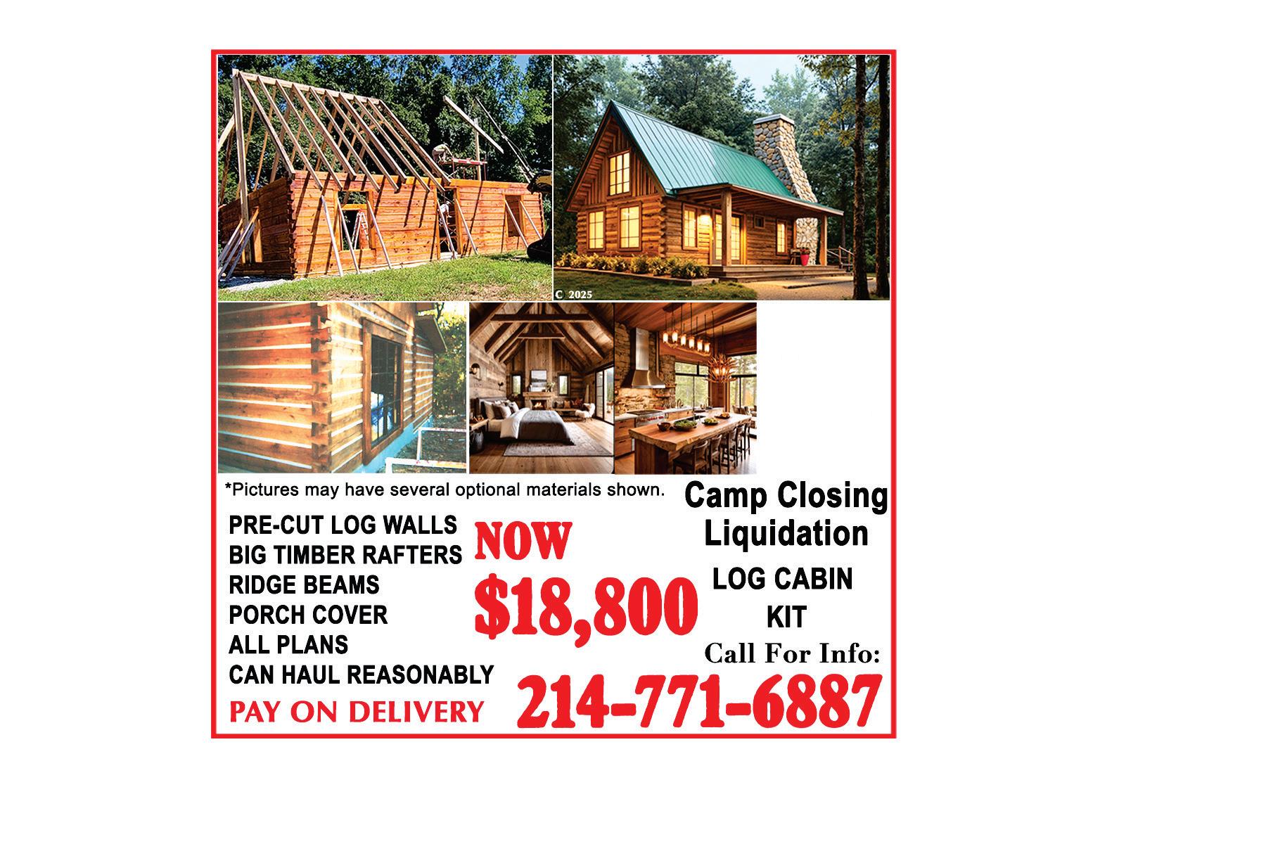 BARGAIN LOG HOME KIT‑ EASY ASSEMBLE. Fully Dovetailed, Pre - Cut Log Wall, Heavy Rafters- Beam Sized, Rustic - Look Roof Planking, Porch Columns & Cover, DIY Super - Fast Assembly! Pay When Delivered! Call to Get Details & Photos, 214-771-6887.