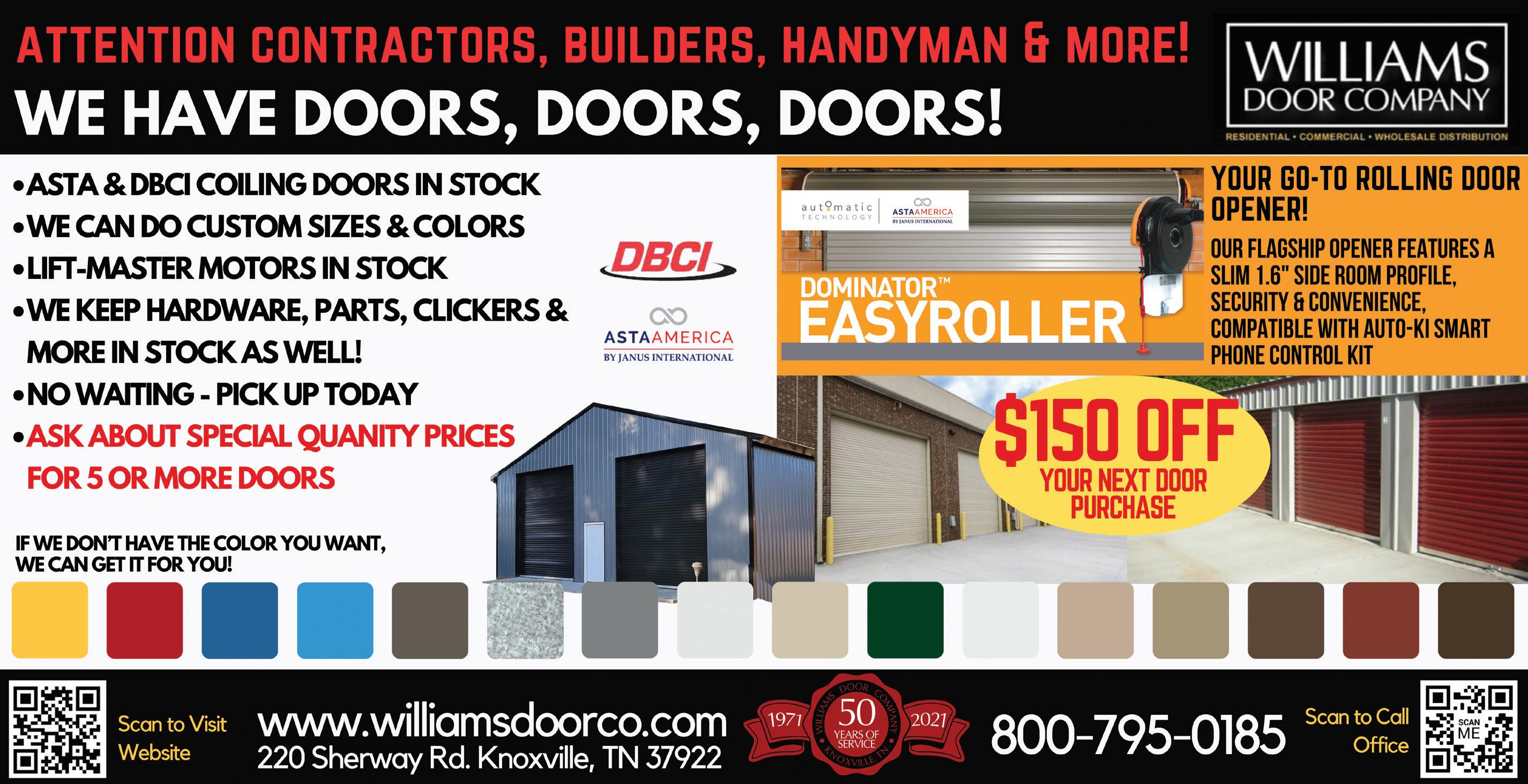 ROLL UP DOORS A huge va riety of sizes available in stock now! We cater to businesses! Save money & time! No wait in stock now! TEXT 865 755 3667 TO ORDER YOUR DOORS TODAY **OFFERING $150 OFF Find out if you qualify!