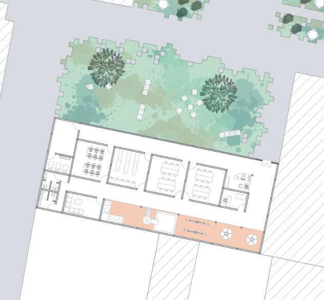 Para lograr una rehabilitación total del sector también se adapta el parqueadero del colegio Benigno Malo, dando un espacio de descanso y trabajo mediante el mobiliario implantado.