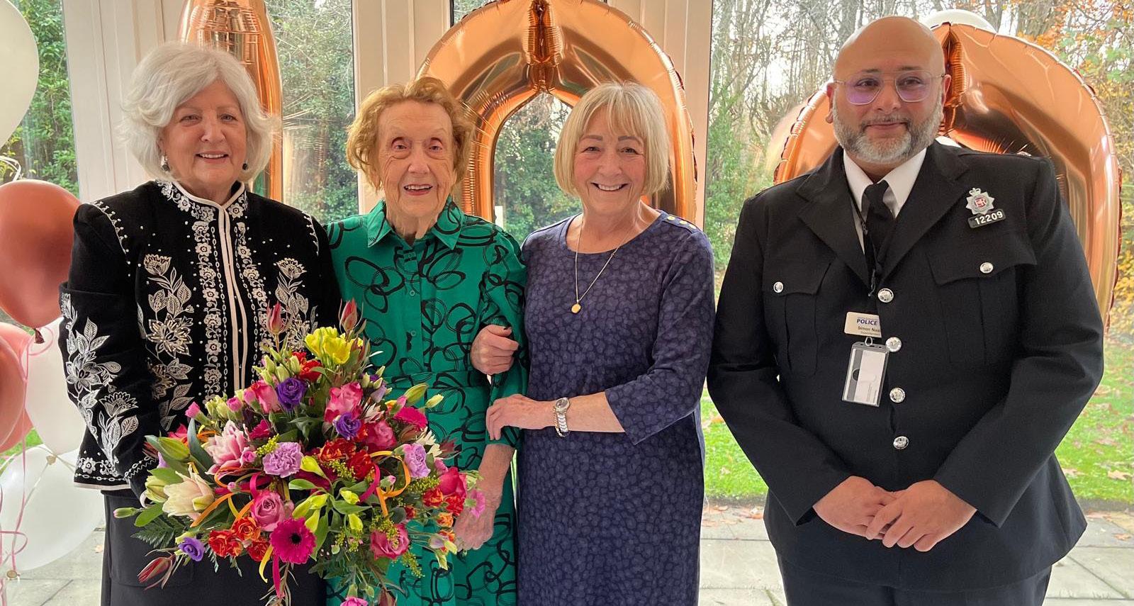 On 25 November 2024 Kathleen Cotton, widow of former GMP sergeant Alan Cotton, celebrated her 100th birthday. To celebrate the occasion, Kathleen was visited by chair of the Manchester branch of the National Association of Retired Police Officers (NARPO) Sandie Wilde and treasurer Maureen Graham, with flowers and a gift; as well as CoM Supt Simon Nasim, who brought a personally written card from GMP Chief Constable Stephen Watson QPM, who was unable to attend.