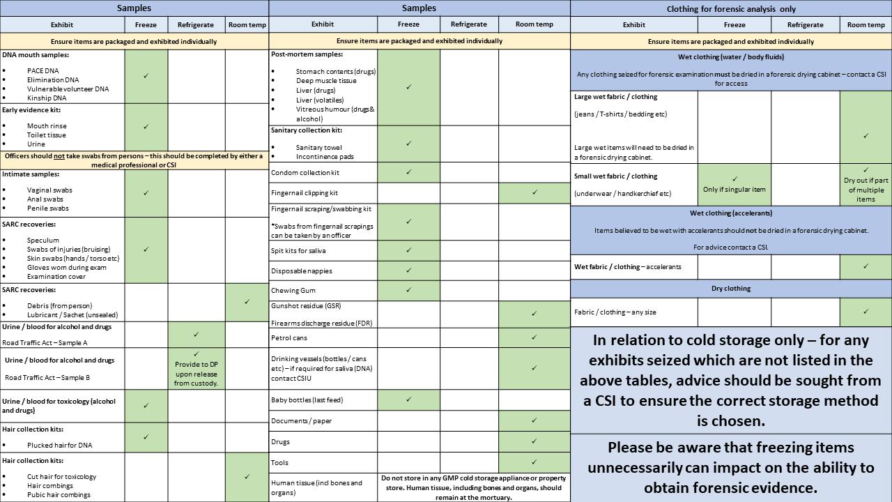 You can learn more about how to package and store specific types of evidence on the Forensic Services intranet page via Home > Branches > Forensic Services.