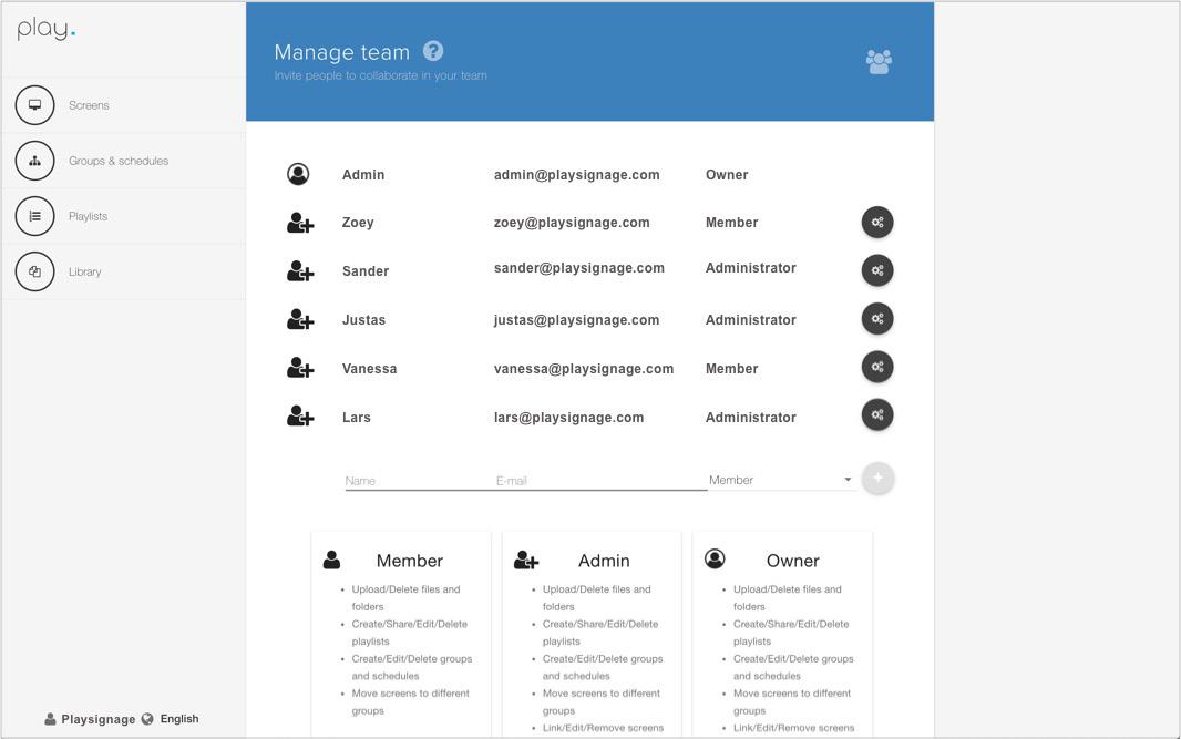Con la ayuda de Teams Feature, puede invitar a sus colegas a su equipo de Play Digital Signage y permitirles administrar sus pantallas y listas de reproducción.