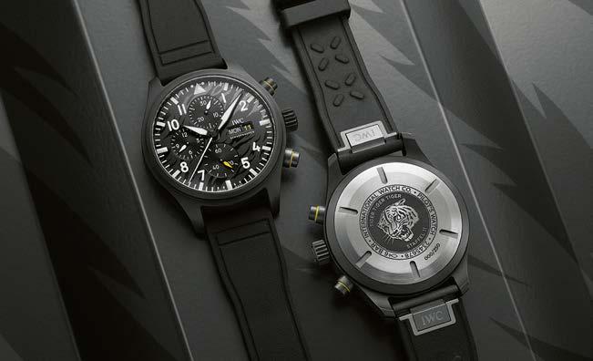 IWC présente la Montre d’Aviateur Chronographe Staffel 11. Limitée à 250 exemplaires, elle se distingue par un boîtier en céramique noire, un fond en titane orné du tigre emblématique de l’escadrille et des détails jaunes inspirés des jets F/A-18.