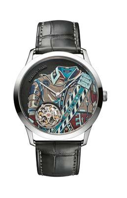 In an entirely different style, Konstantin Chaykin welcomed visitors to his booth with an astonishing painting featuring elements of his brand-new White Rabbit: a perpetual calendar with 16 complications that is both wristwatch and pocket watch. A watchmaker as well as a painter personally, he placed himself within his painting titled A Mad Horological Party, inviting enthusiasts to comment on his various mechanical and artistic creations.