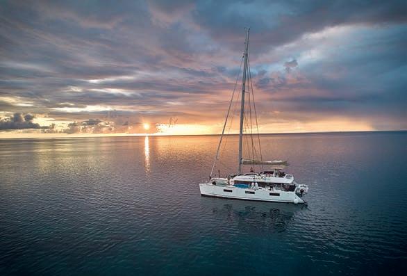 Tout simplement beau, épuré et esseulé, brûlant de soleil, le Lagon Bleu attire évidemment les bateaux d’excursions et leurs chargements de touristes. L’un des motus, équipé de carbets avec tables et barbecues, en est l’épicentre. C’est ici que se concentre le flux des visiteurs, à son abord que croisent raies manta, requins et bancs de poissons, clou d’un spectacle assuré grâce à un généreux appâtage. Si l’absence remarquée d’Éole, une rareté qui devrait s’étendre à toute notre croisière, nous prive de pouvoir tâter de la puissance du grand soixante-deux pieds, cette pétole nous o re en revanche le luxe de conserver notre position pour la nuit. Dès le milieu d’après-midi, alors que les vedettes repartent dare-dare plein nord en direction des hôtels et pensions, nous nous retrouvons délicieusement seuls. Un ciel aux rouges endiablés ponctue théâtralement cette féconde journée. Une nuit d’un noir d’encre nous plonge sans guère de transition dans une obscurité immobile à peine percée par de très fugaces cris d’oiseaux furtifs. Aucune stridence, aucune odeur de terres ne vient s’immiscer. Imprégnées de ce grand calme, arrivent les riches heures du dîner, celles de la légèreté de l’instant, du partage des souvenirs. Les témoignages et expériences de tous nos compagnons sont autant de trésors à engranger.