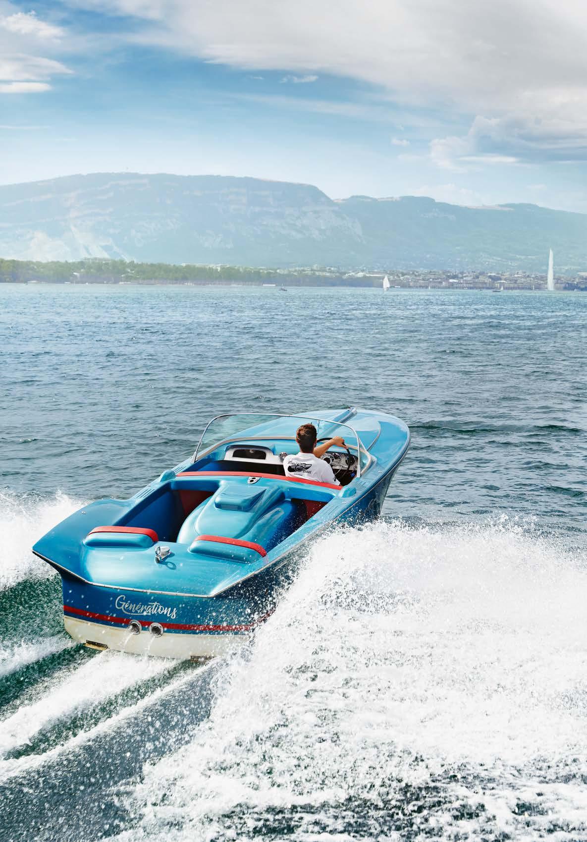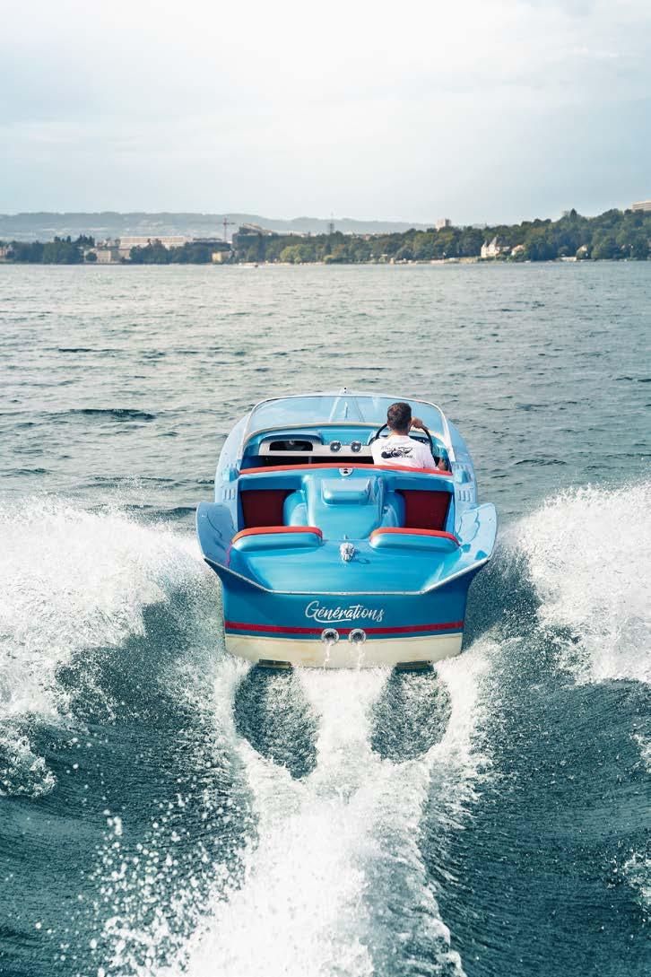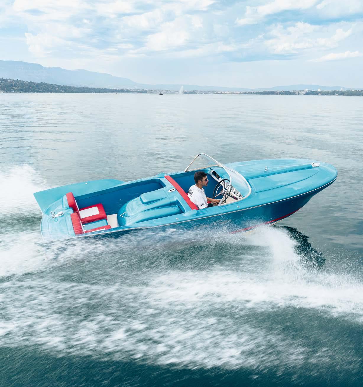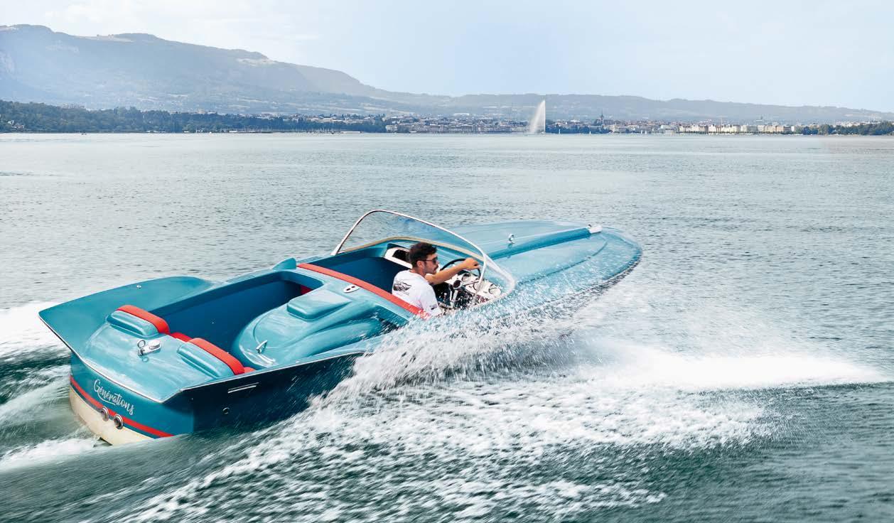An Bord eines Chris Craft Silver Arrow aus dem Jahr 1959 ziehen wir unsere Spur durchs Wasser und fühlen uns dabei in die glorreiche Zeit der amerikanischen Autos und Motorjachten zurückversetzt. Das letzte Boot, das von Wood & Boat in Meinier restauriert wurde, lässt Nostalgie aufkommen. Sein glitzerndes Blau, das träge Brummen des Motors und die Heckflossen im Cadillac-Stil katapultieren die Passagiere mitten in die Sixties und den American Way of Life. Man könnte fast vergessen, dass man in einem Boot sitzt. Willkommen am Steuer eines klassischen Automobils, das mit viel Leidenschaft und Liebe zum Detail restauriert wurde!