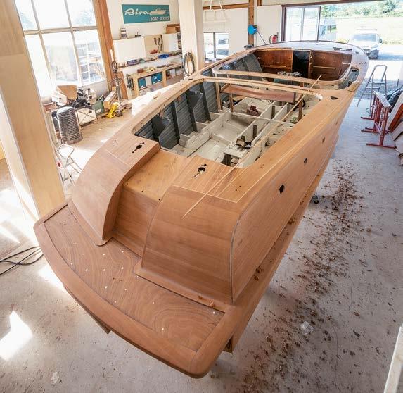 Der von Wood & Boat restaurierte Silver Arrow wurde vor langer Zeit von einem Botschafter in die Schweiz importiert und wechselte dann mehrmals den Besitzer und sein Aussehen, bevor er mehrere Jahrzehnte in einer Scheune vor sich hinrottete. «Ein Vorbesitzer hatte die Heckstruktur komplett verändert, um eine grosse Sonnenliege zu montieren», erklärt Augustin Lépine. «Wir haben gründlich recherchiert, damit wir die ursprünglichen Formen hinbekommen.» Dort, wo es gerechtfertigt war, hat sich die Werft aber dennoch die eine oder andere Abweichung vom Original erlaubt. «Wir wenden moderne Restaurierungstechniken an und nehmen kleine Verbesserungen vor. Beispiele hierfür sind die eleganten und praktisch mit Druckknöpfen montierbaren Fenderleinen, die LED-Leuchten der neuen Generation im Rumpf und das hydraulische Wendegetriebe, das im Motor anstelle des mechanischen Wendegetriebes eingebaut ist. Wie so oft machten die Holzarbeiten einen grossen Teil des zeitlichen Aufwands aus. «Wir haben die Beplankung nahezu ganz entfernt und alle Klüsen sowie zwei Drittel der Spanten ausgetauscht», so der Schiffbauer.