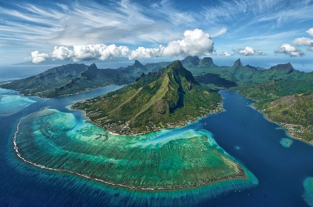 MOOREA, JADIS NOMMÉE AIMEHO (OU EIMEO), ÉMERGÉE DES EAUX IL Y A TROIS MILLIONS D’ANNÉES, A LA FORME D’UN TRIDENT AVEC SES DEUX BAIES SPLENDIDES : CELLE DE COOK, À GAUCHE DE L’IMAGE, ET CELLE D’OPUNOHU, À DROITE, AVEC LE VILLAGE DE PAOPAO.