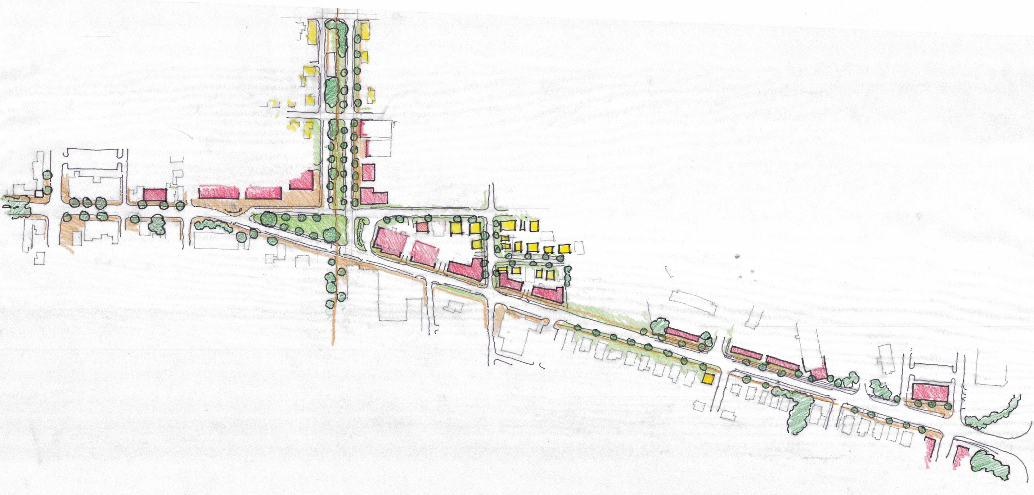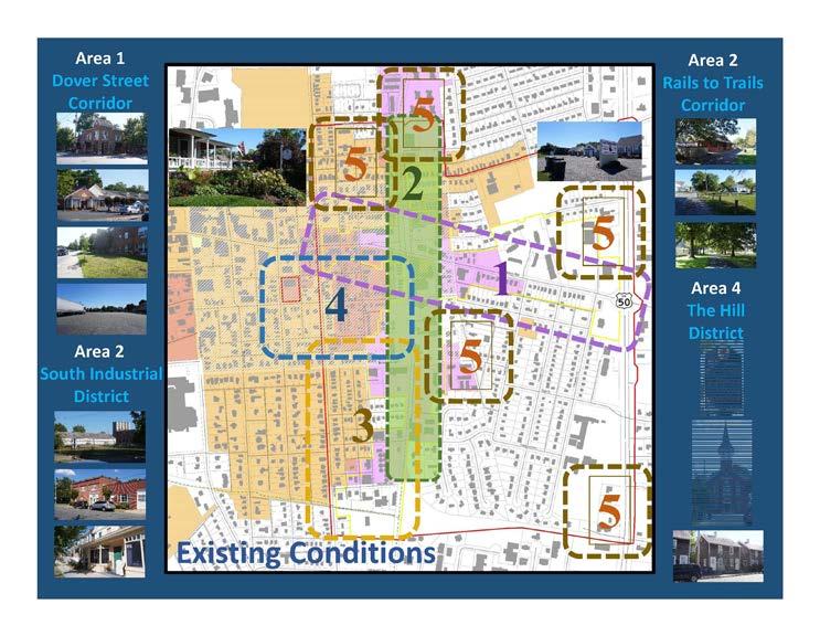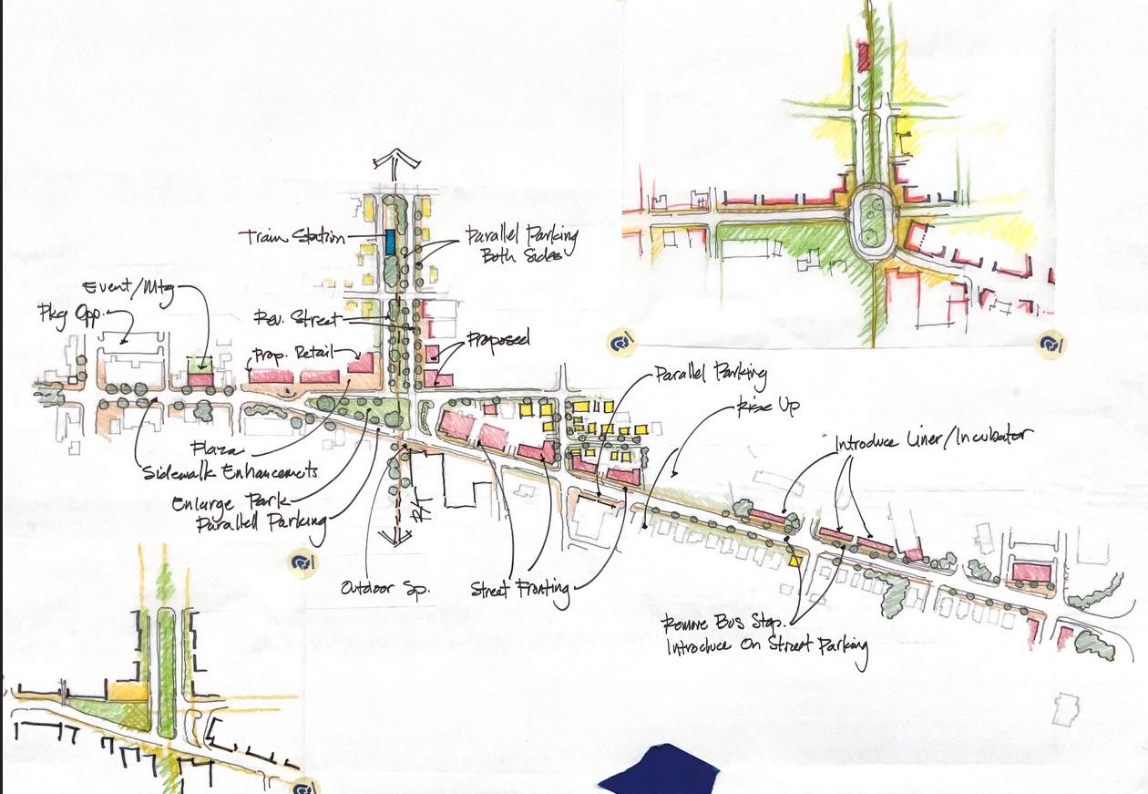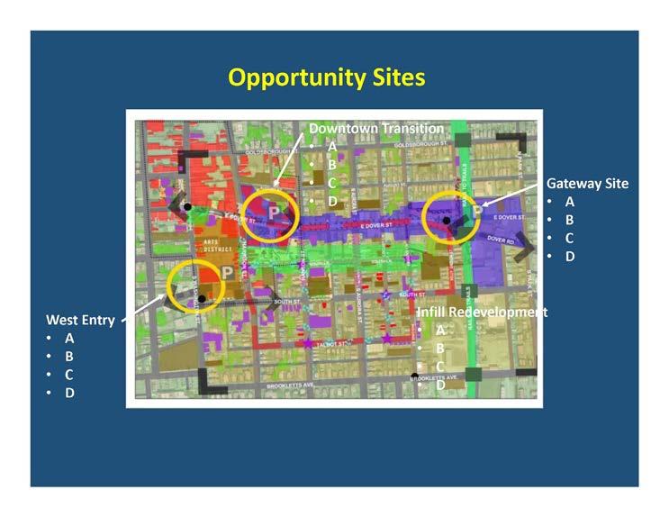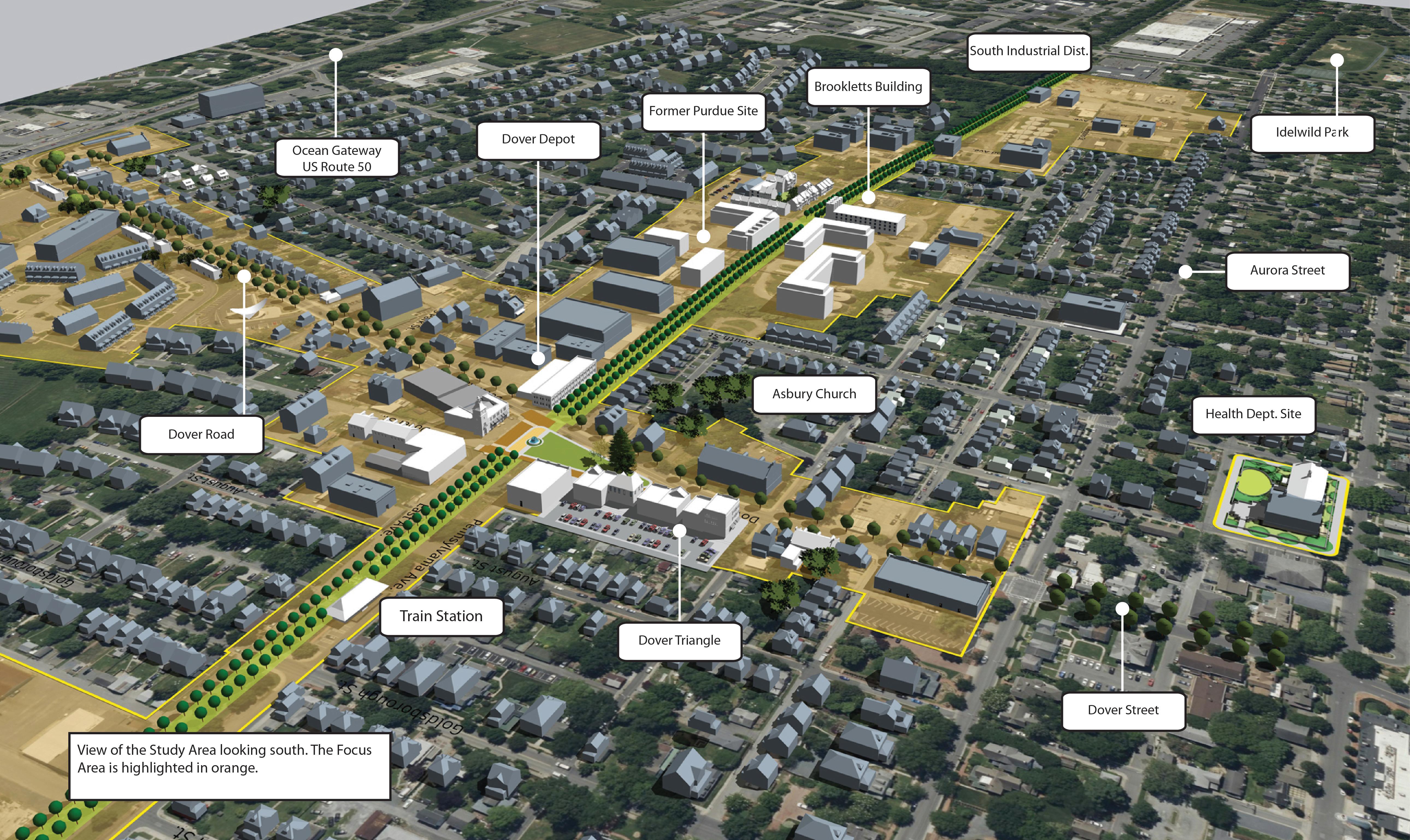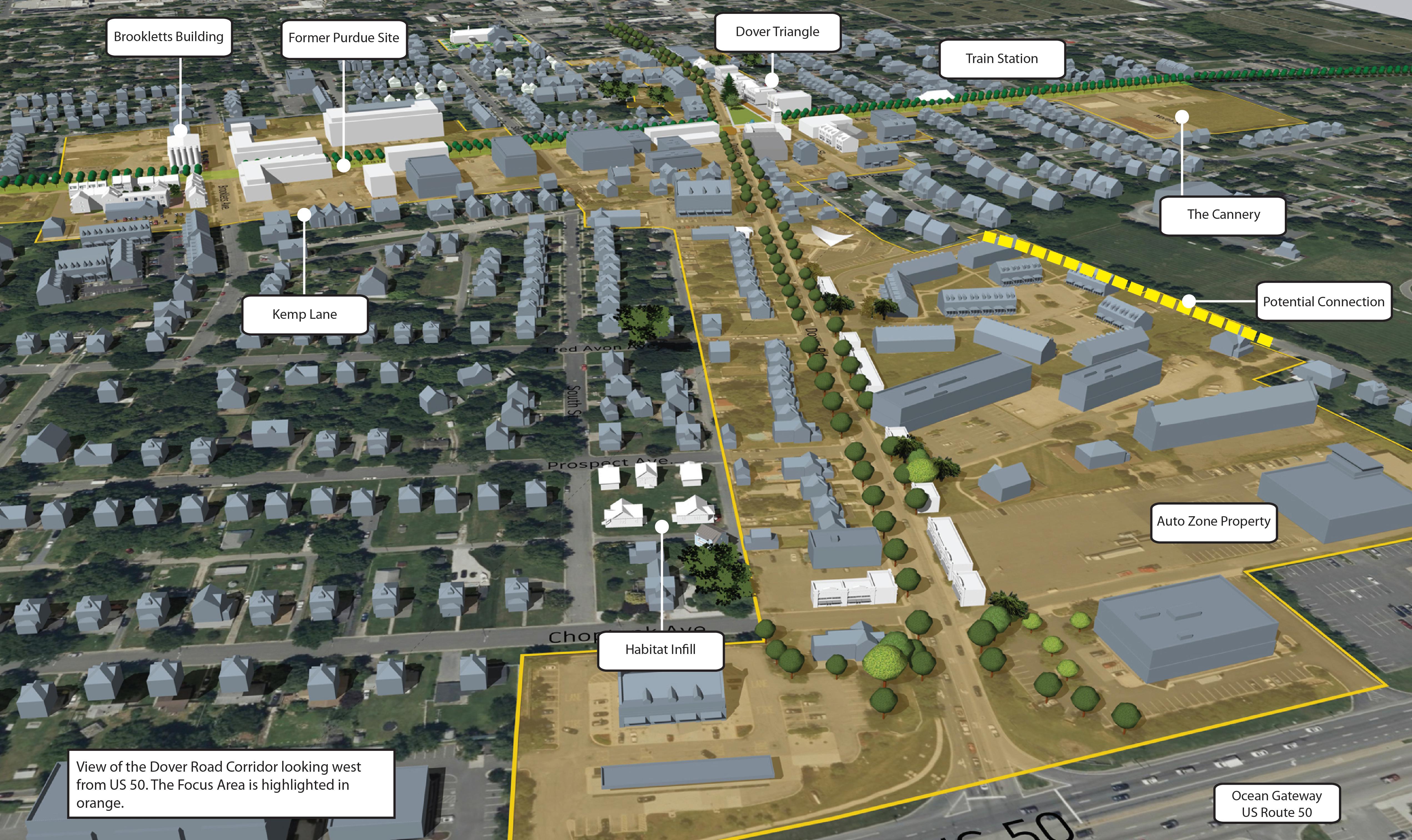 The Charrette also identified specific “catalytic” sites that are primed for redevelopment, providing illustrative examples and recommendations as to how those sites might be redeveloped based on the proposed policy-based improvements to the existing Zoning Code, along with improvements in pedestrian safety throughout the Study Area, with the intent of “bringing Downtown east,” along the Dover Street corridor, all the way to Route 50. And, by flagging potential locations for improved thoroughfare network connectivity utilizing existing street alignments and potential new street connections.