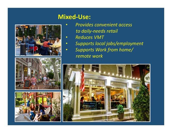 • Adopting Formed Based Codes, and/or modifying existing bulk regulations to support more compact, mixed-use infill development in a traditional urban format;