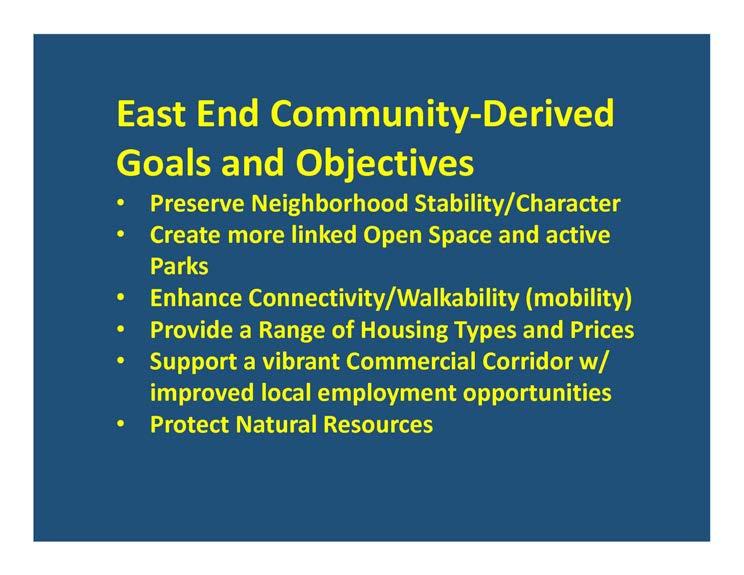 • Provide logo/branding/signage at intersection and throughout area to promote/identify East End