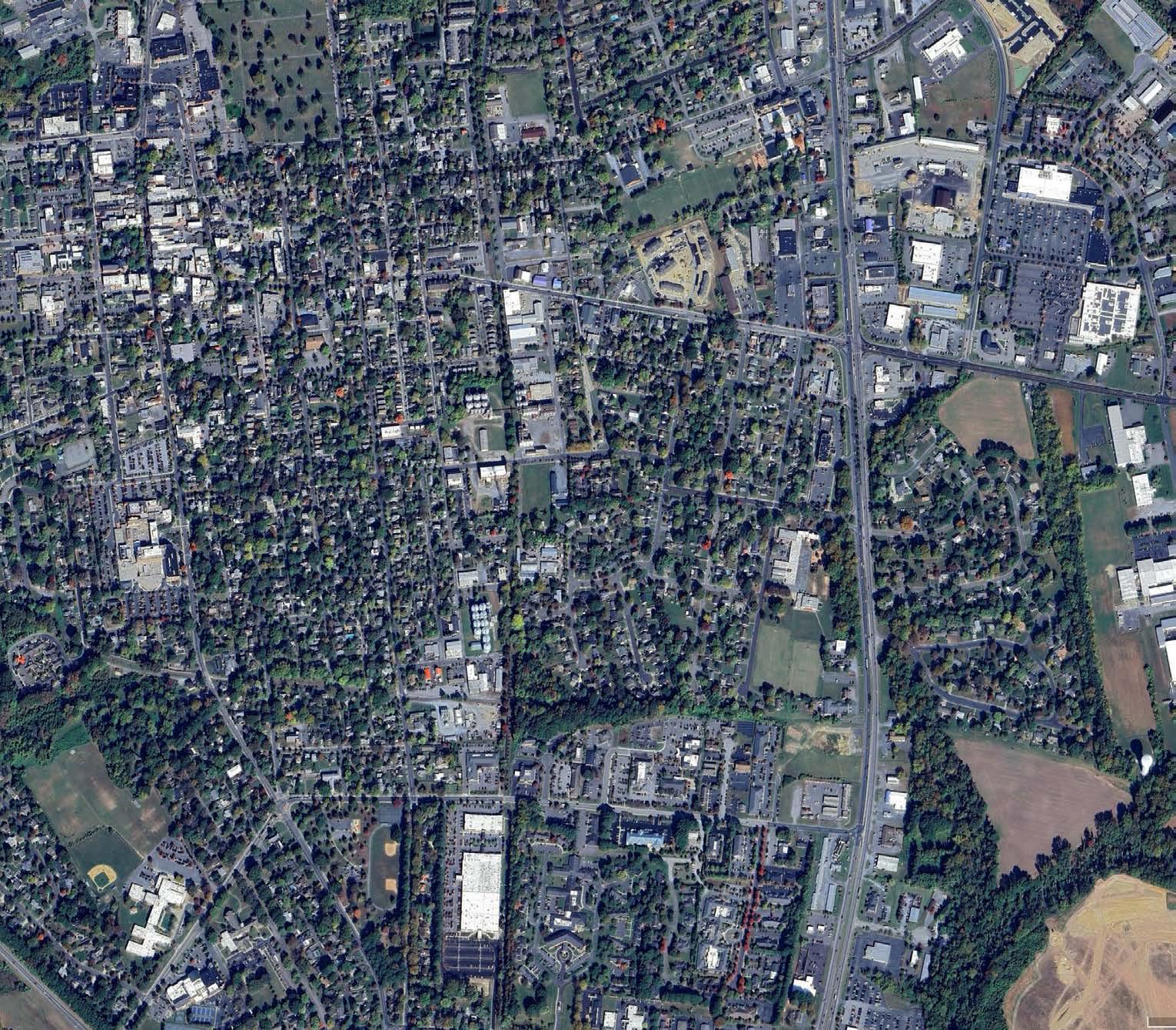 Figure 1. Satellite View of Downtown Easton and East End Study Area outlined in yellow (Source: Google Earth)