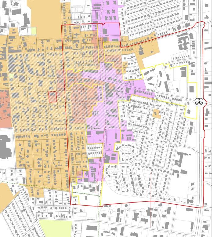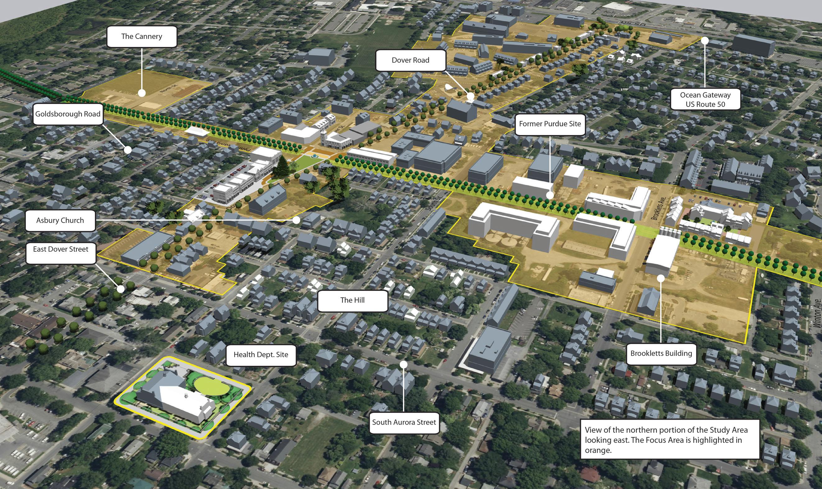 The Study Area boundaries for the Plan are approximately defined as Cherry and Goldsborough Street to the north, Aurora Street to the west, Idlewild Avenue to the south, and US Route 50 to the east. In addition to the overall Study Area, a number of Focus Areas were identified for more specific and detailed attention during the interactive Charrette phase of the process.