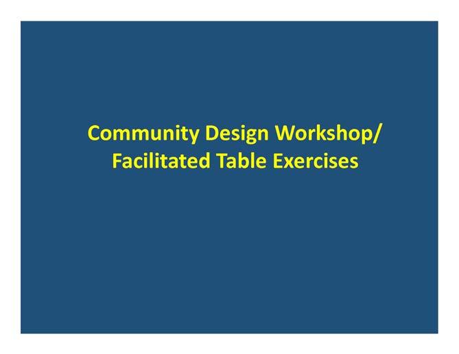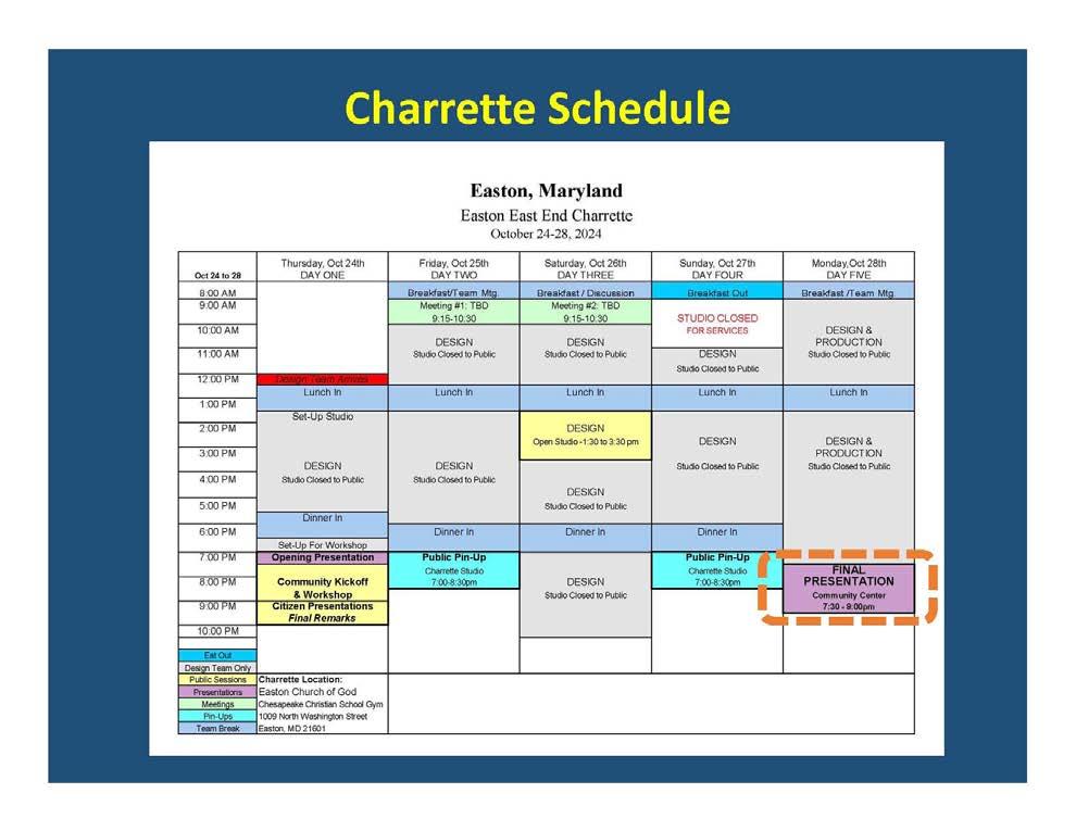 The Charrette itself was a four-day process, beginning with an opening night presentation and community design workshop, followed by interim pin-ups each day, showing incremental improvements to the plan, and a final presentation of the completed plan and work products.