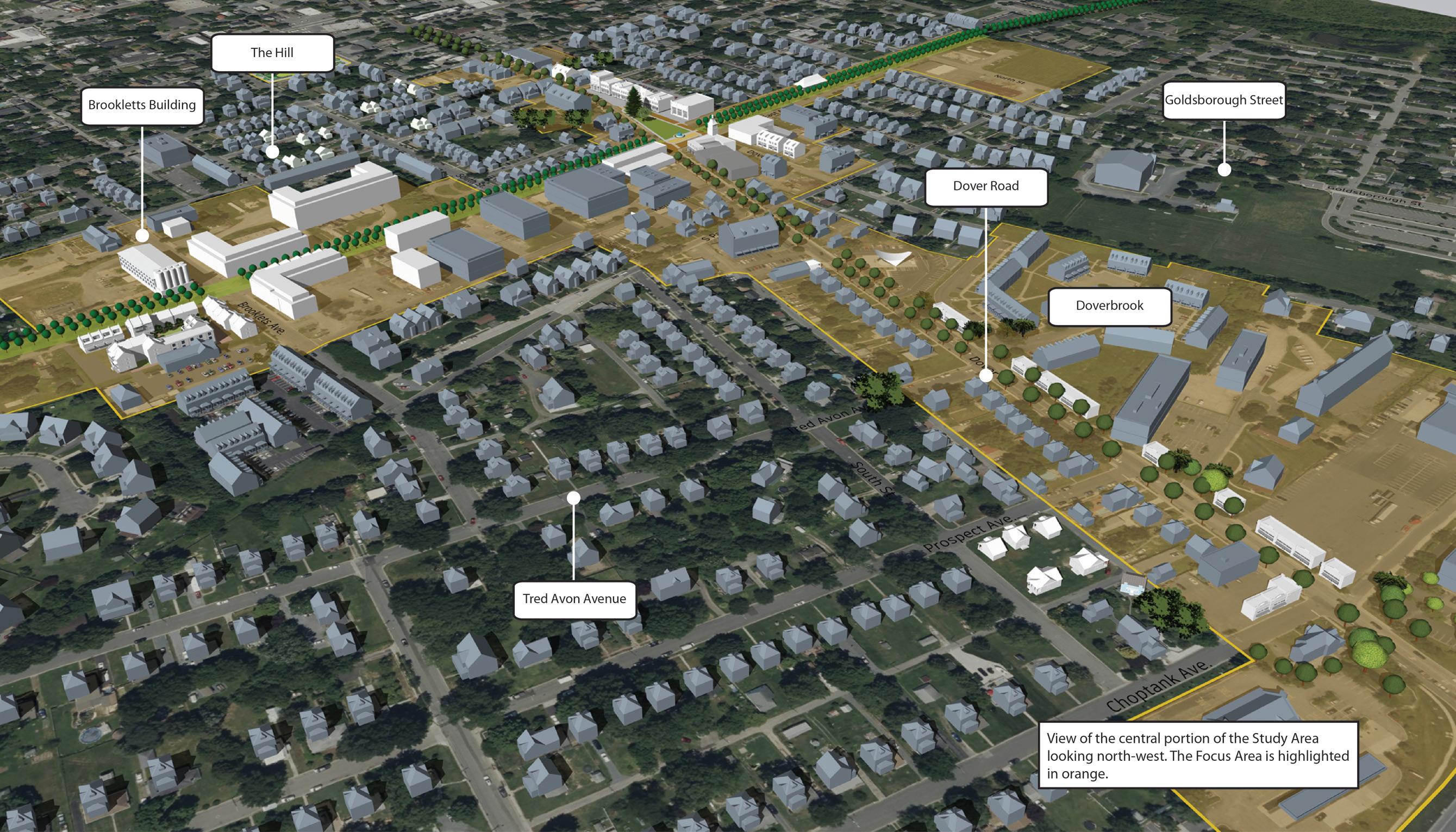 The Charrette produced an overall Framework Plan for the entire Study Area, with six detailed focus areas, showing both the larger context area, as well as the specific location of each of the designated focus areas within the East End. Each focus area was designed and drawn at a larger scale, showing more explicit detail, and accompanied by additional exhibits, including renderings, digital photo montages showing before-andafter conditions, and 3-D digital models. A video of the principle public open space, known as the Dover Triangle, was also created.