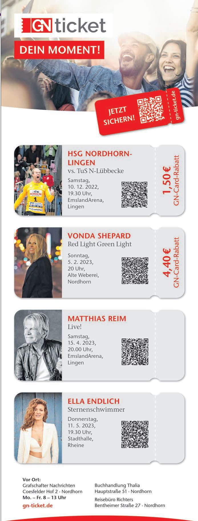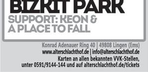 SEITE 4 Veranstaltungen 05 Let´s swing for X-Mas in der Alten Weberei 06 Bei Sänger Billy Andrews trifft Rock auf Klassik 06 Status Quo spielen schnörkellosen Mix aus Rock und Boogie 07 Ein Wiedersehen mit dem Aalto Jazz Trio & Friends 07 Das Ensemble „Schellack“ ist auch weihnachtlich unterwegs 08 Krimi-Dinner mit dem Schauspiel Dinner Nordhorn 08 Ben Becker lässt ins Herz der Finsternis blicken