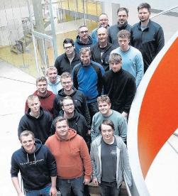 N a c h d e r Ü b e r g a b e d e r Z e r t i f i k a t e k a m e n d i e a n g e h e n d e n M ec h a t r o n i k e r u n d E l e k t r o n i k e r f ü r B e t r i e b s t e c h n i k u n d i h r e A u s b i ld e r z u m G r u p p e n f o t o i m N I N O - H o c h b a u z u s a m m e n F o t o : B i l d u n g s w e r k d e r G r a f s c h a f t e r W i r t s c h a f t