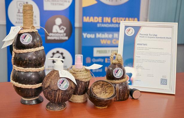 Kraftia’s was granted the esteemed privilege to display the Made in Guyana Standards Mark on their locally manufactured Coconut Shell products including Coconut Cups, Coconut Decanters, Coconut Wine Goblets, Coconut Ash trays, Coconut Soap Dishes, Coconut Chandeliers and Coconut Bowls