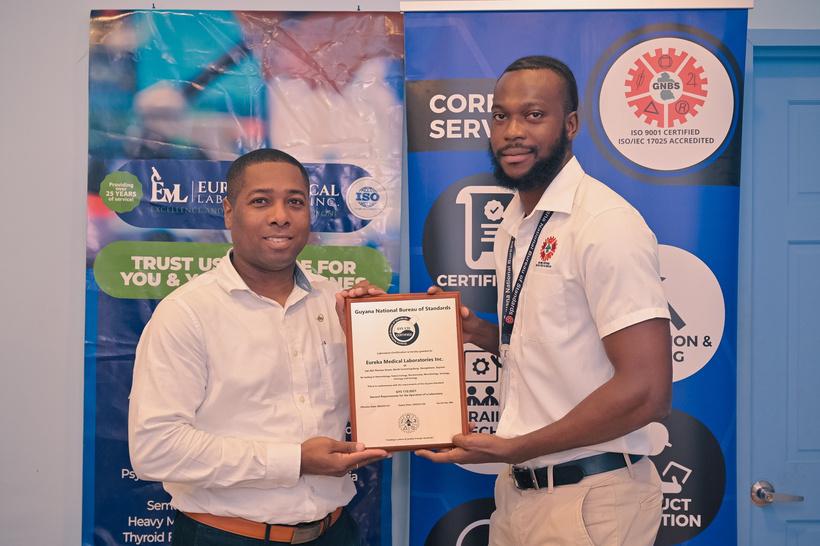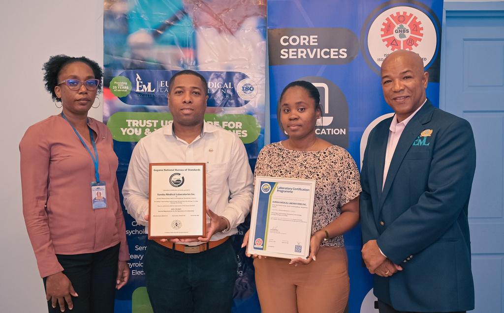 During the brief handing over ceremony, GNBS Technical Officers, Mr. Orlando Sturge and Ms. Yan Yi Zhu presented the renewed certificate and plaque to Eureka Medical Laboratories Inc.’s Chief Executive Officer, Mr. Andrew Boyle and Quality Manager, Mr. Shawn Manbodh.