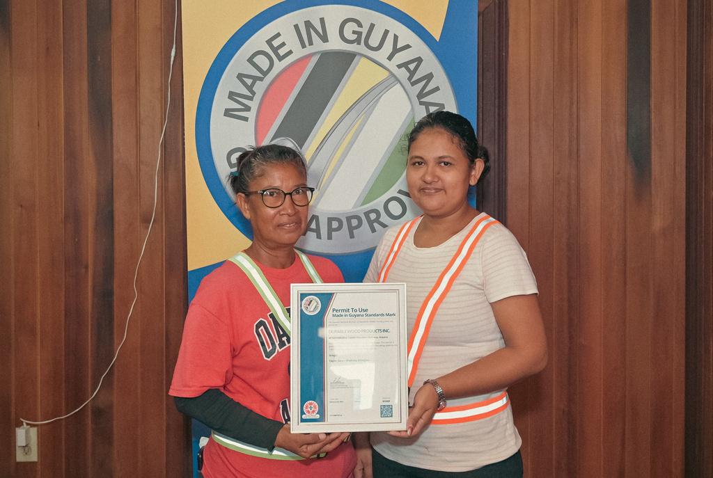 During a very simple but significant ceremony, the esteemed Made in Guyana Certificate was presented to DWP’s Store Manager, Ms Joycelyn Gouveia and Office Clerk, Ms Esther Lall-Mendonca by GNBS Technical Officers, Ms Asha Sookoo and Mr Orlando Sturge