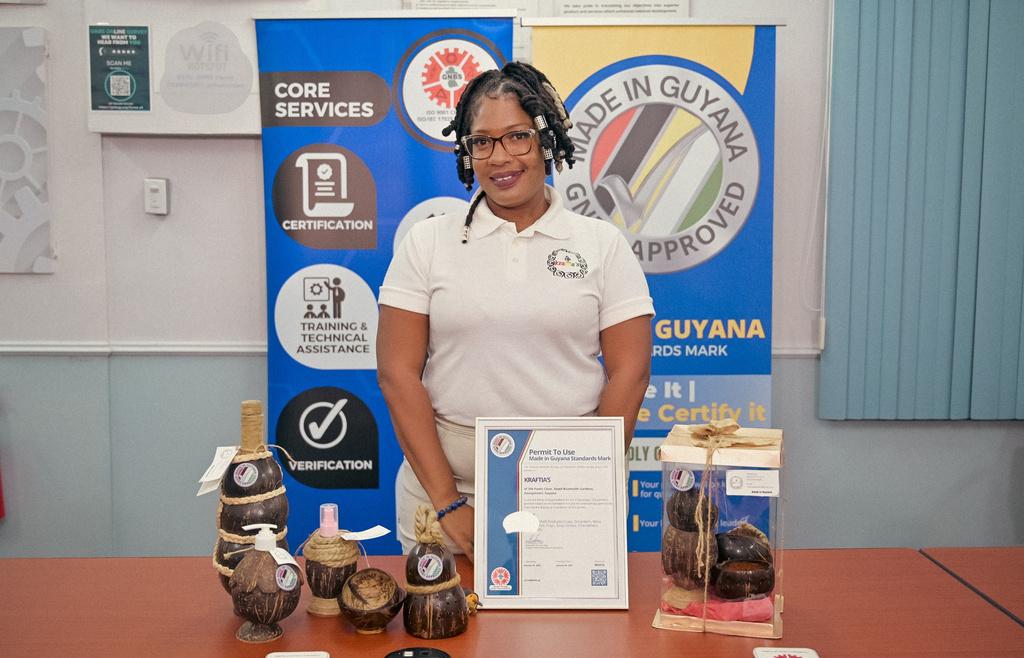 The certificate was formally presented in the boardroom of the GNBS Head Office, located at the National Exhibition Complex, Sophia, Georgetown by GNBS Head of Certification Services, Mr. Keon Rankin to Proprietress and Designer of Kraftia’s, Ms Marlloyd Kyte