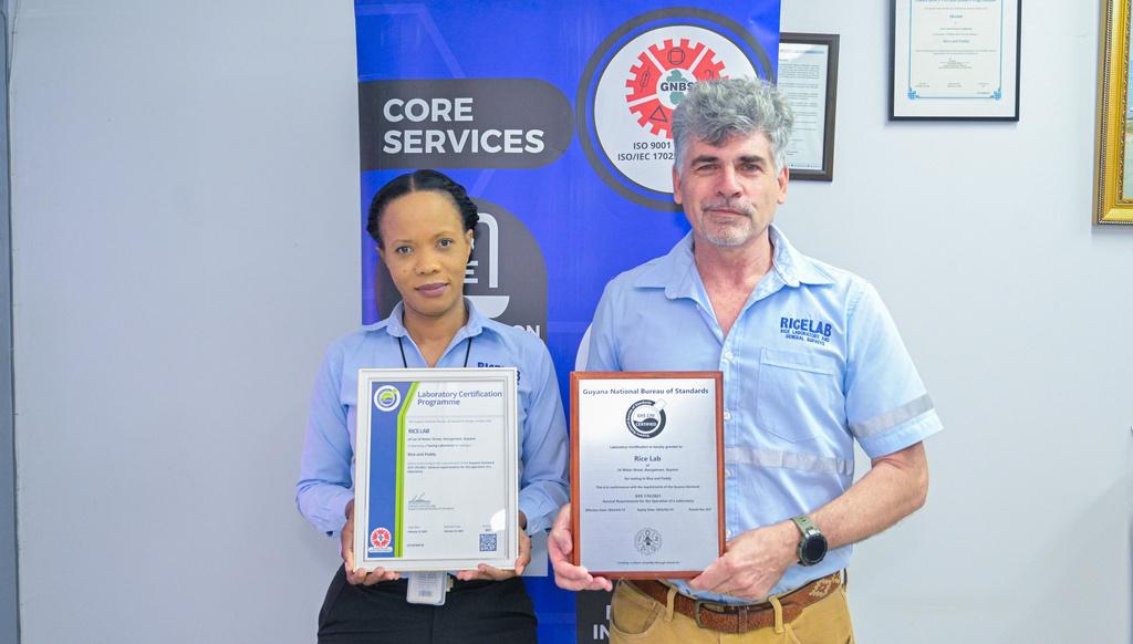 During the brief handing over ceremony, GNBS Technical Officers, Ms. Yan Yi Zhu and Mr. Peter-Ho-A-Lim presented the renewed certificate and plaque to Rice Lab Laboratory Manager (Ag.), Ms. Shellon Bidder and Manager, Mr Pierre Boucher