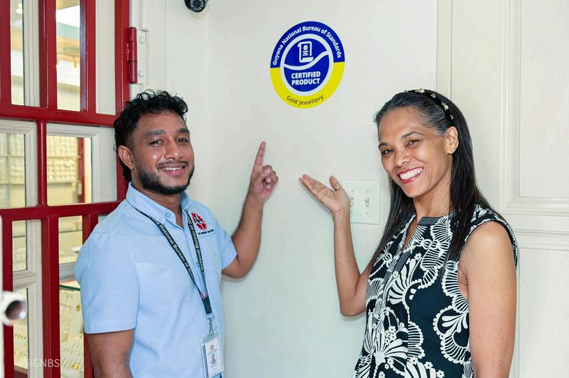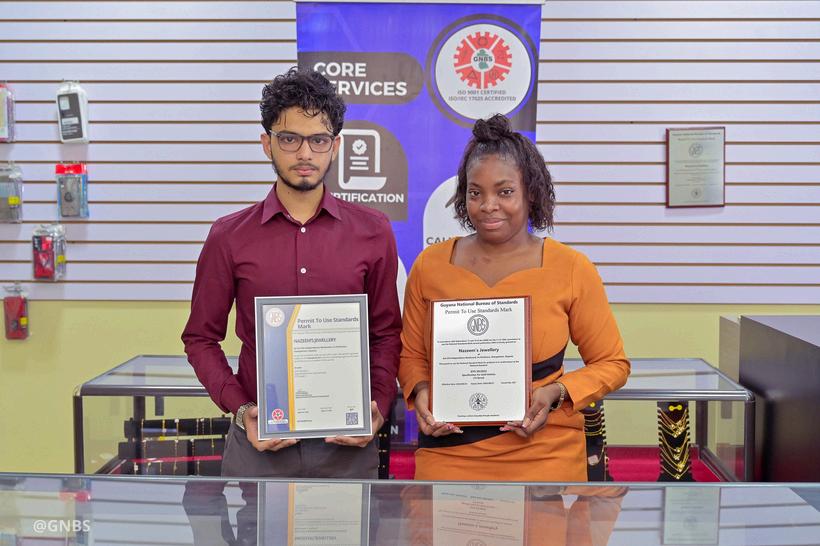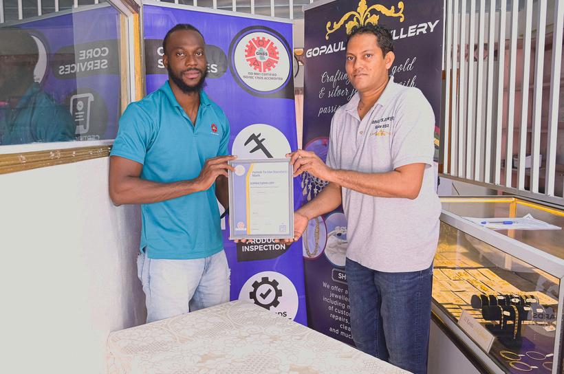 During a brief ceremony, GNBS Technical Officer Orlando Sturge handed over a certificate and plaque to the proprietors of Gopaul’s Jewellery, Rampersaud Gopaul and Udo Gopaul