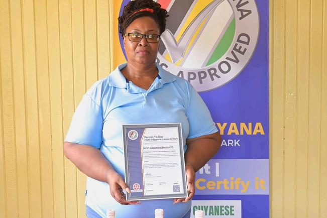 During the handover at the company’s location, the Made in Guyana Certificate was presented by GNBS Technical Officer, Orlando Sturge to the CEO of Dick’s Seasoning Products, Dawn Edwards-Dickson