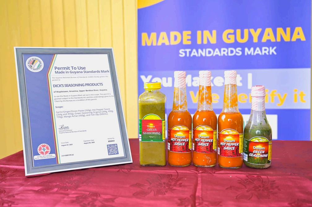 Located in Mapletown, Aroaima, Upper Berbice River, Dick’s Seasonings can now use the mark on its Garlic/Ginger/Onion Paste (350g), Hot Pepper Sauce (284g and 450g), Green Seasoning Original (284g, 450g 730g), Mango Ăchar (450g), and Fish Dip (500ml).