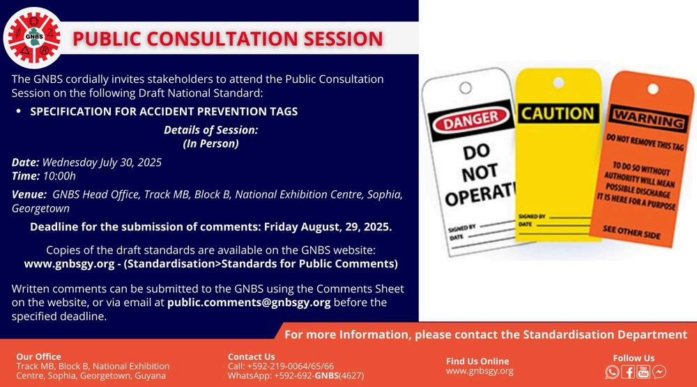 The GNBS recently reviewed National Standard, GYS 208:2002 – Specification for Accident Prevention Tags, which covers temporary hazard warning tags used in industrial, marine, and commercial settings.