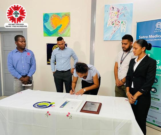 In a brief ceremony, a plaque and certificate were handed over by the Technical Officers of the GNBS Mr. Keon Rankin and Mr. Orlando Sturge to Managing Director of Woodlands Hospital Limited, Dr. Neville Gobin and Quality Manager, Ms. Hemwatie Kumar.