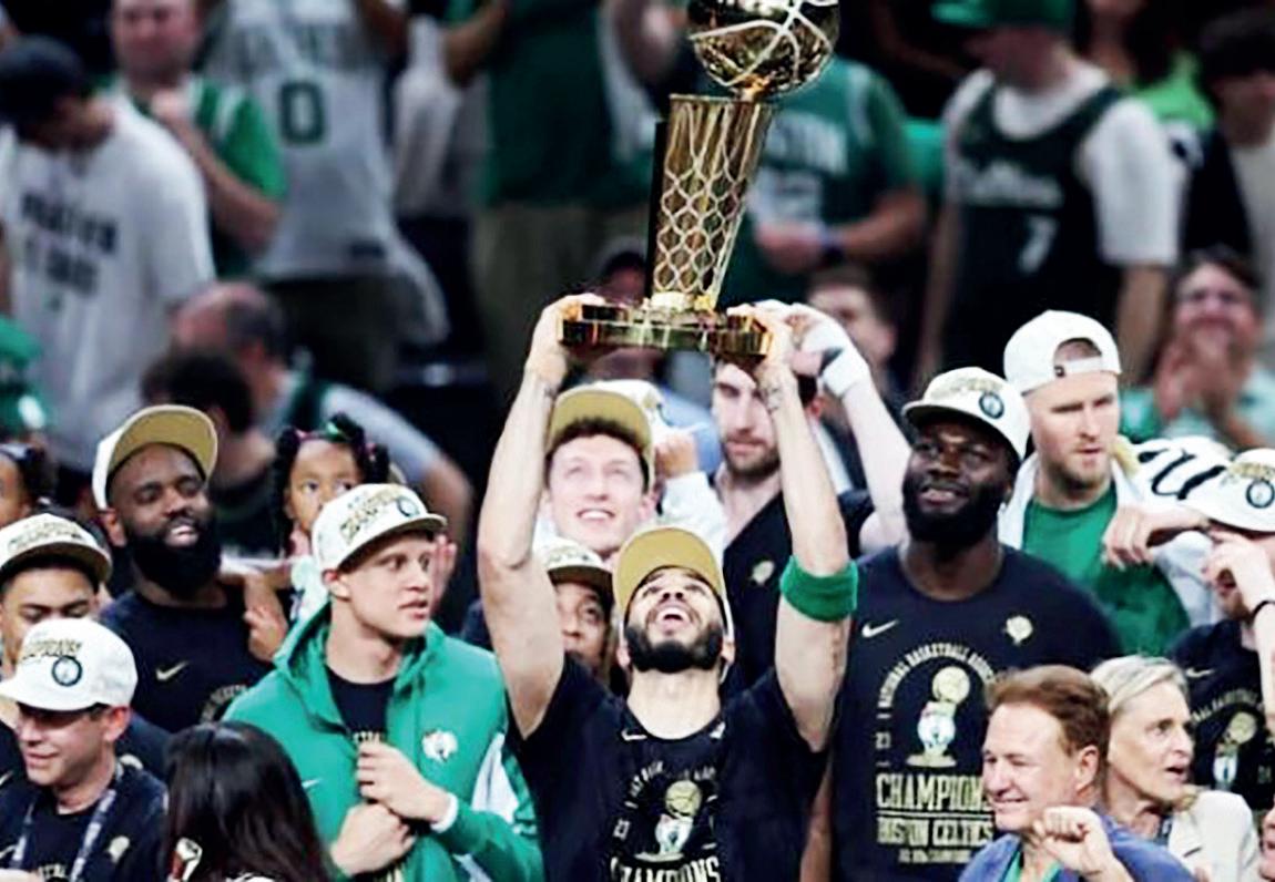 Jayson Tatum ergue, orgulhoso, o troféu Larry O’Brien