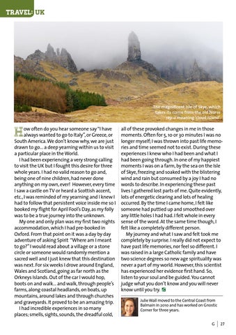 ow often do you hear someone say “I have always wanted to go to Italy”, or Greece, or South America. We don’t know why, we are just drawn to go… a deep yearning within us to visit a particular place in the World. I had been experiencing a very strong calling to visit the UK but I fought this desire for three whole years. I had no valid reason to go and, being one of nine children, had never done anything on my own, ever! However, every time I saw a castle on TV or heard a Scottish accent, etc., I was reminded of my yearning and I knew I had to follow that persistent voice inside me so I booked my flight for April Fool’s Day, as my folly was to be a true journey into the unknown. My one and only plan was my first two nights accommodation, which I had pre-booked in Oxford. From that point on it was a day by day adventure of asking Spirit “Where am I meant to go?” I would read about a village or a stone circle or someone would randomly mention a sacred well and I just knew that this destination was next. For six weeks I drove around England, Wales and Scotland, going as far north as the Orkneys Islands. Out of the car I would hop, boots on and walk… and walk, through people’s farms, along coastal headlands, on boats, up mountains, around lakes and through churches and graveyards. It proved to be an amazing trip. I had incredible experiences in so many places; smells, sights, sounds, the dreadful cold,