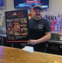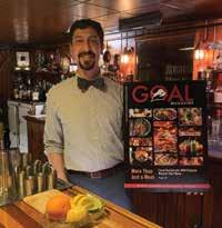 Co-owner Josh Jones sports his “Drink Local Beer” Marino’s t-shirt behind the bar at the original Greensburg restaurant while showing off the GOAL Magazine cover.