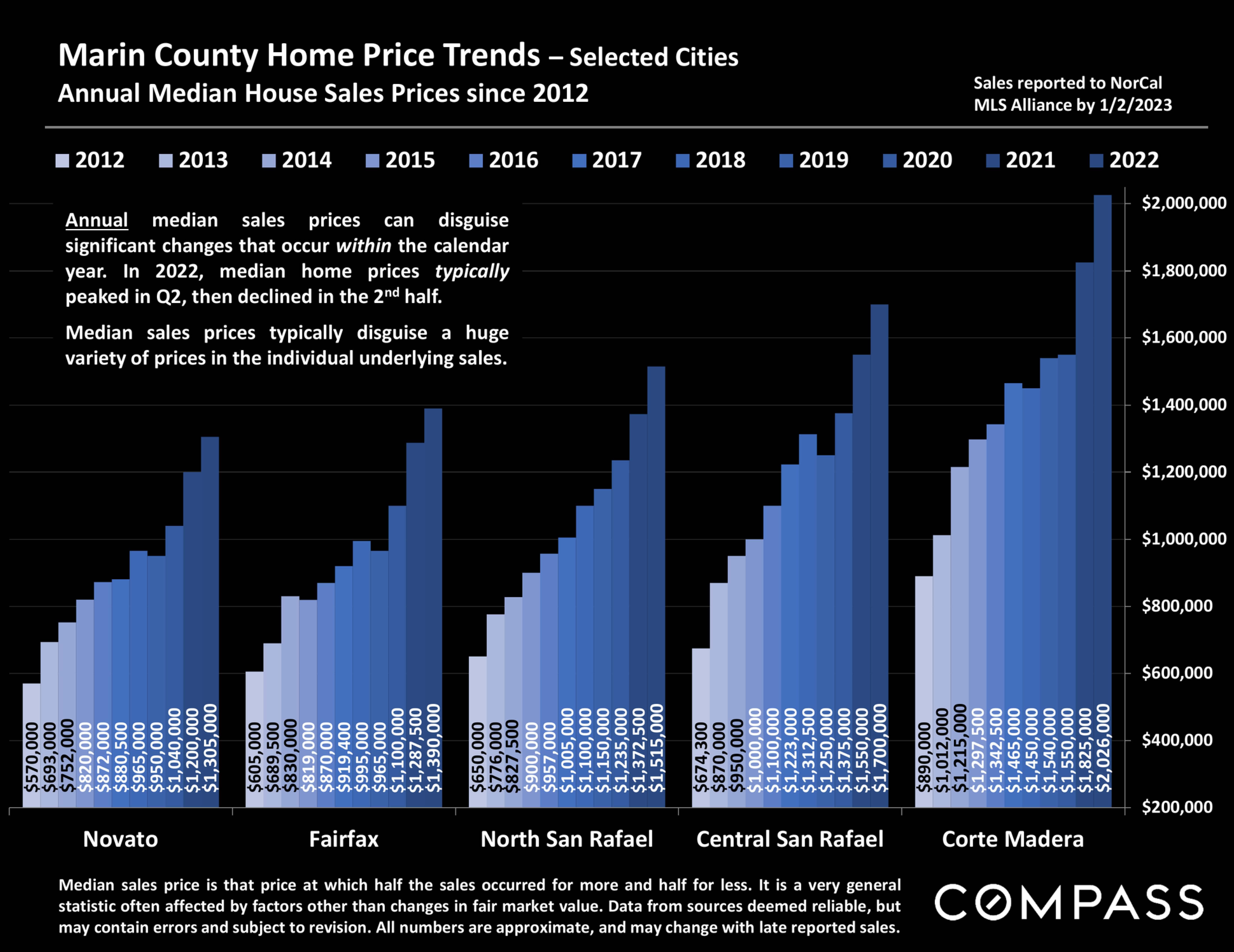 *Sales reported to NorCal MLS Alliance during the 4 months through mid-late March 2023. Excluding "fixer uppers." Counties contain submarkets of widely varying values. Median values fluctuate for reasons besides changes in fair market value. Data from sources deemed reliable, but may contain errors and subject to revision. Numbers approximate, andmay change with late reportedsales. Not all salesare reportedto MLS.