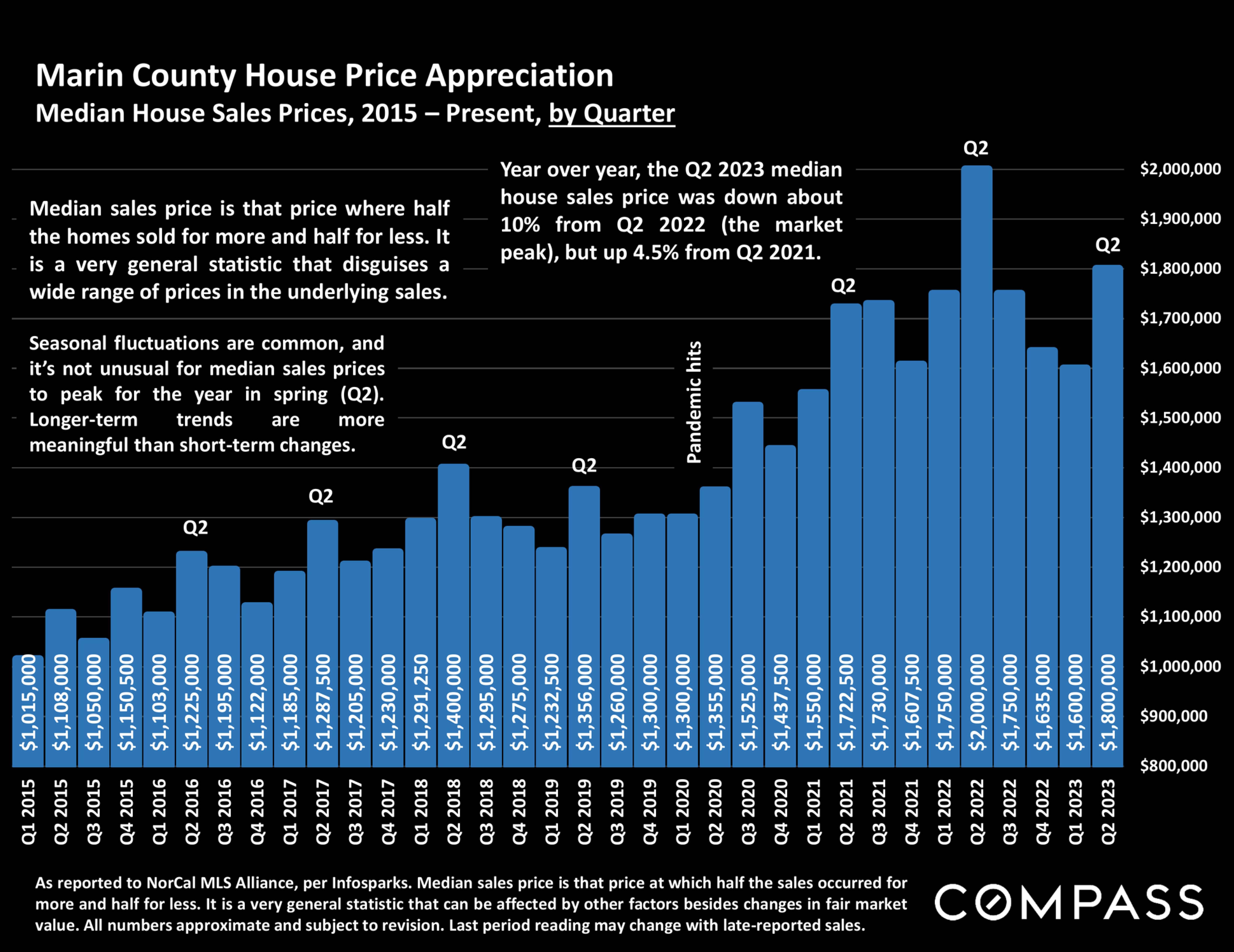 *Sales reported to NorCal MLS Alliance during the 4 months through mid-late March 2023. Excluding "fixer uppers.'' Counties contain submarkets of widely varying values. Median values fluctuate for reasons besides changes in fair market value. Data from sources deemed reliable, but may contain errors and subject to revision. Numbers approximate, and may change with late reported sales. Not all sales are reported to MLS.