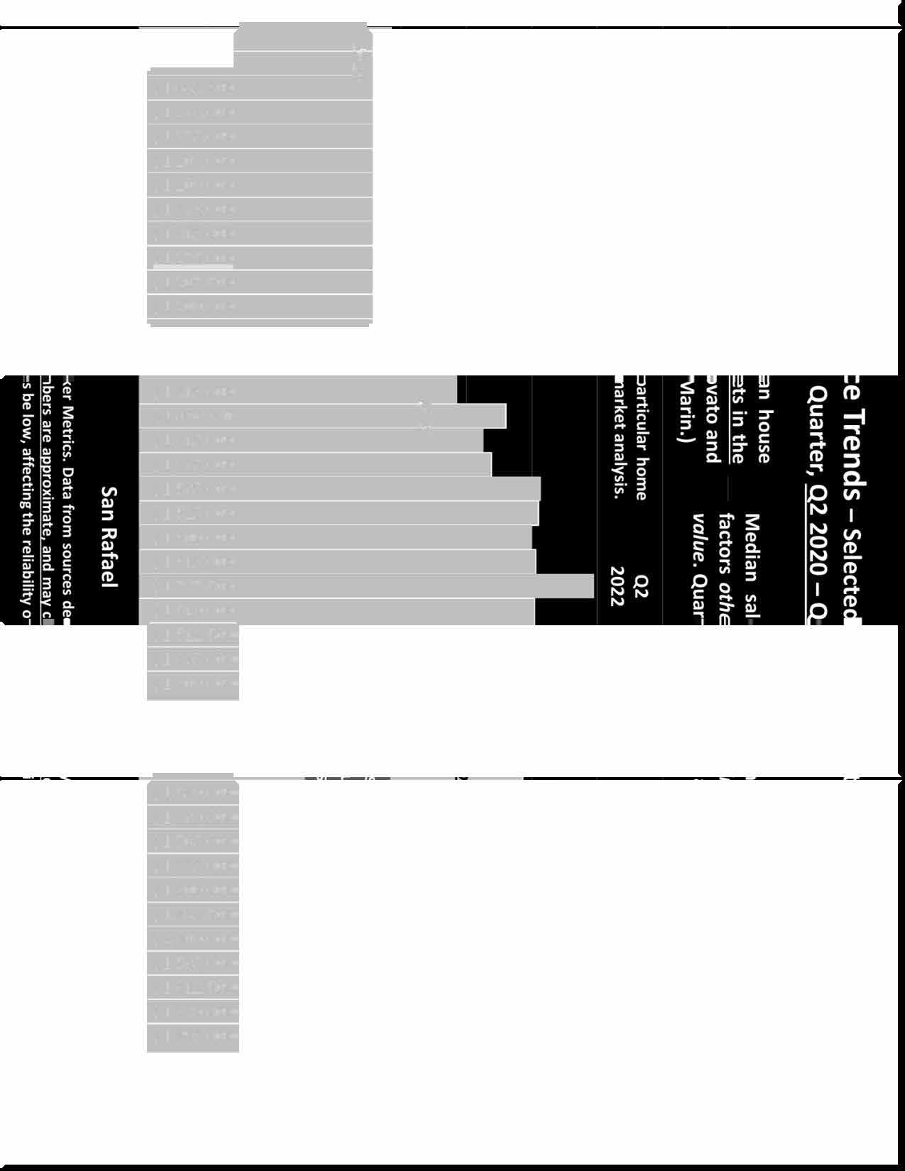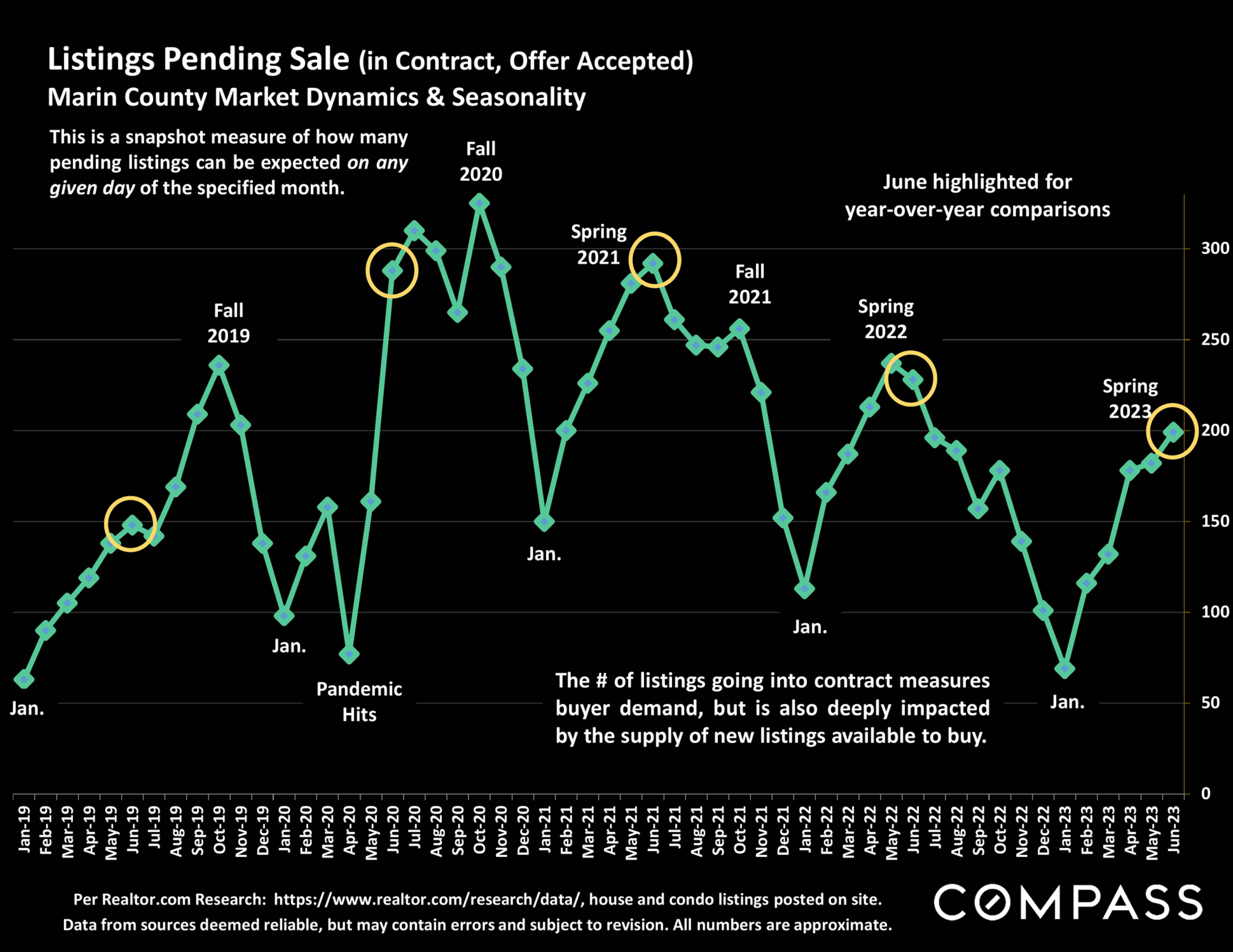 Statistics are generalities, essentially summaries of widely disparate data generated by dozens or hundreds of unique, individual sales occurring within different time periods. They are best seen not as precise measurements, but as broad, comparative indicators, with reasonable margins of error. Anomalous fluctuations in statistics are not uncommon, especially in smaller, expensive market segments. Last period data should be considered estimates that may change with late-reported data. Different analytics programs sometimes define statistics - such as "active listings," "days on market," and "months supply of inventory" - differently: what is most meaningful are not specific calculations but the trends they illustrate. Most listing and sales data derives from the local or regional multi-listing service (MLS) of the area specified in the analysis, but not all listings or sales are reported to MLS and these won't be reflected in the data. "Homes" signifies real-property, single-household housing units: houses, condos, co-ops, townhouses, duets and TICs (but not mobile homes), as applicable to each market. City/town names refer specifically to the named cities and towns, unless otherwise delineated. Multi-county metro areas will be specified as such. Data from sources deemed reliable, but may contain errors and subject to revision. All numbers to be considered approximate.