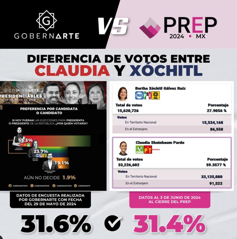 En nuestra encuesta publicada el 29 de mayo estimamos una diferencia entre Claudia Sheinbaum y Xochitl Gálvez de 31.6% y los datos oficiales al cierre del PREP arrojaron una diferencia del 31.4%. Pronóstico casi exacto.