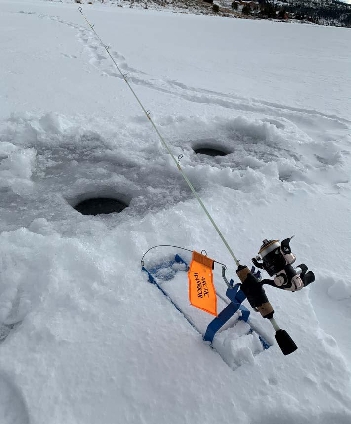 You can also run dead sticks outside and a great tool is the Clam Arctic Warrior. The Arctic Warrior works in conjunction with your dead stick rod and is a metal tip down device that has a flag that pops up when a fish hit. These remote set line systems are very durable and simple. You can run the rod with the bail open or closed. When a fish hits the minnow, the rod will simply drop down towards the hole and the flag will pop up. You than simply grab the rod and set the hook.