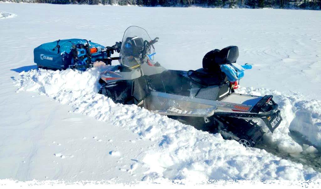 snowmobile to the fishing grounds and the next, you’re bogging down in winter’s version of quicksand. It’s even worse when an ATV or pickup’s wheels break through the upper crust and the vehicle bottoms out in the slop. Since the latter situations are especially problematic, I greatly prefer snowmobiles whenever slush is possible, and will focus on snowmobile-related tips from here on out.