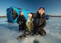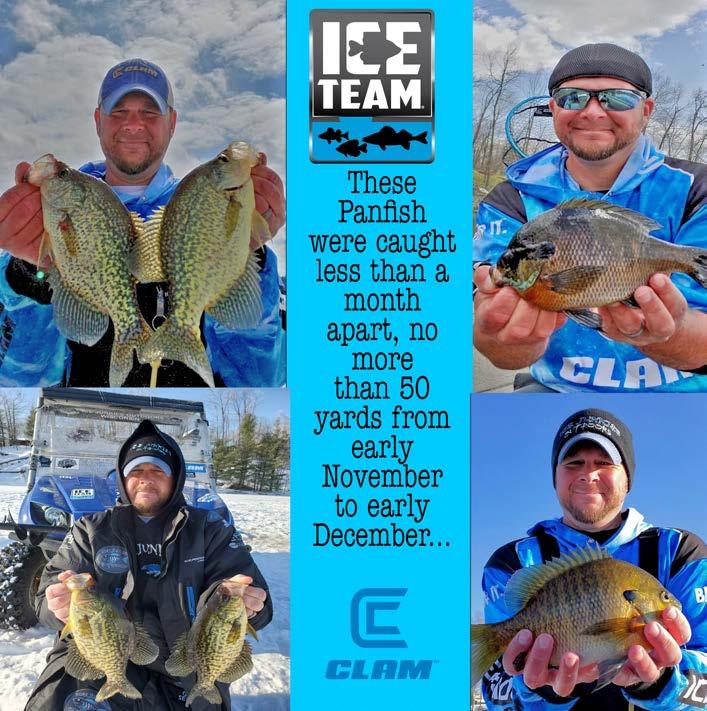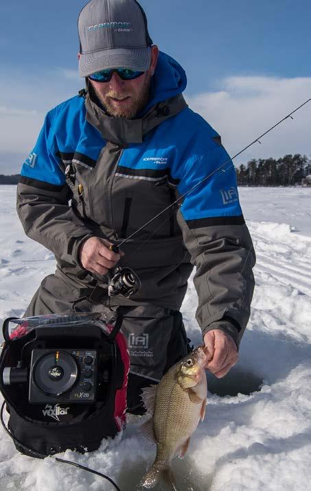 line from there to the basin area of your lake. The panfish will be located somewhere in between. Find out what food sources are available to them by using an underwater camera off your boat, or by doing seasonal research on your lake by staying in tune with your surroundings (are there water bugs present on top of the water during summer months, are there mayfly hatches that take place or was there a good class minnow fry up in the shallows that you noticed?) Use that gained knowledge to “match the hatch” and you will have put yourself in a position to be very successful come first ice! n