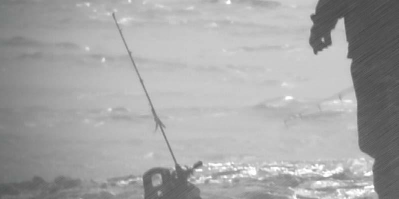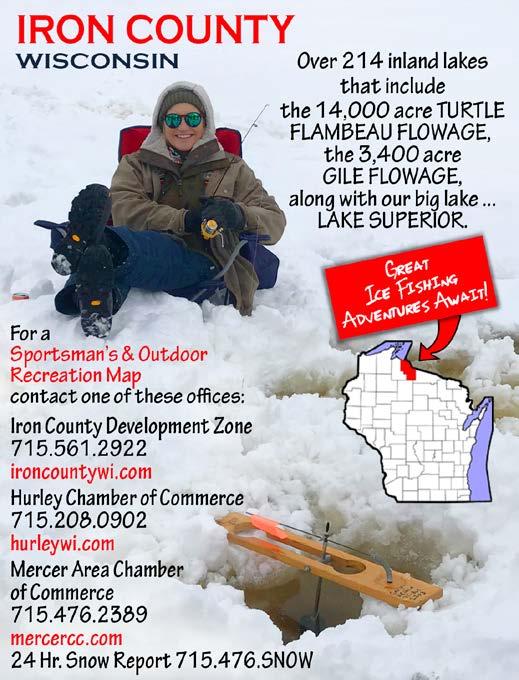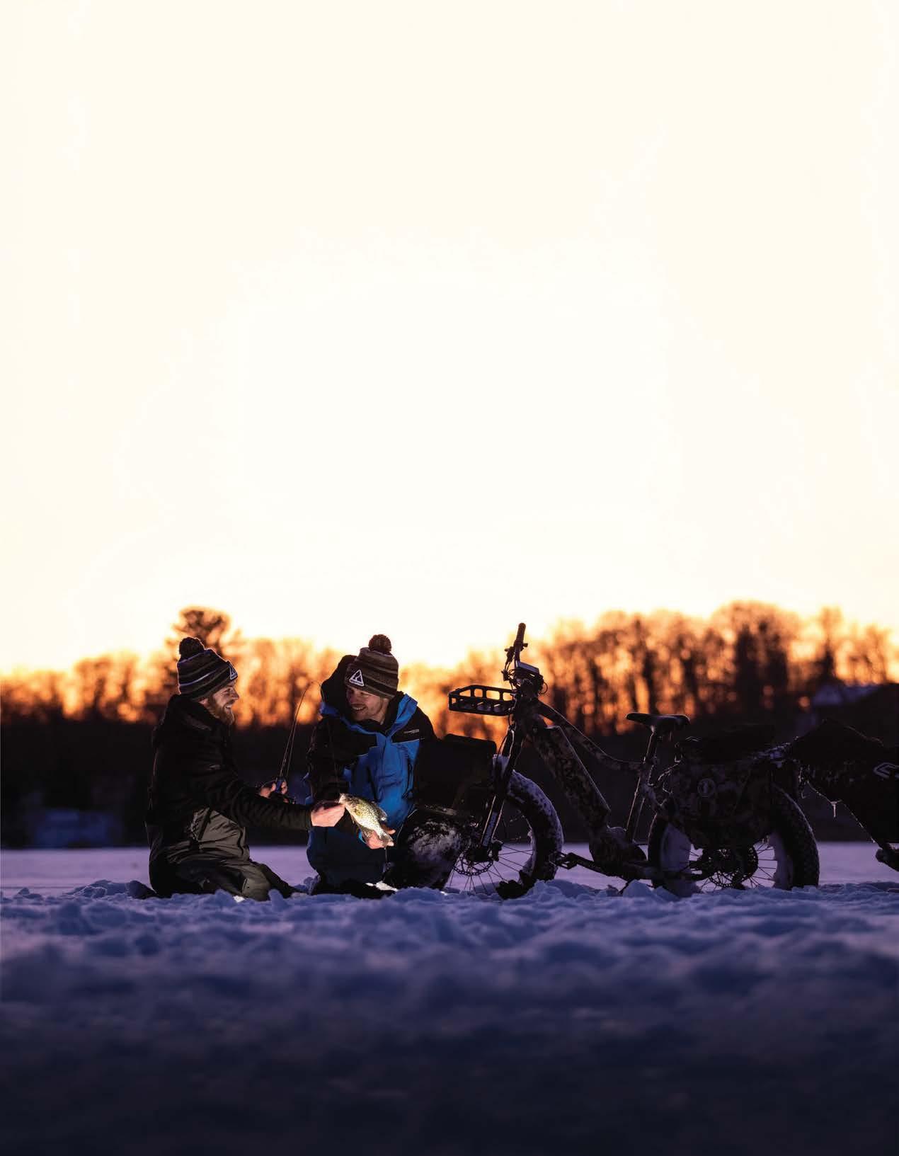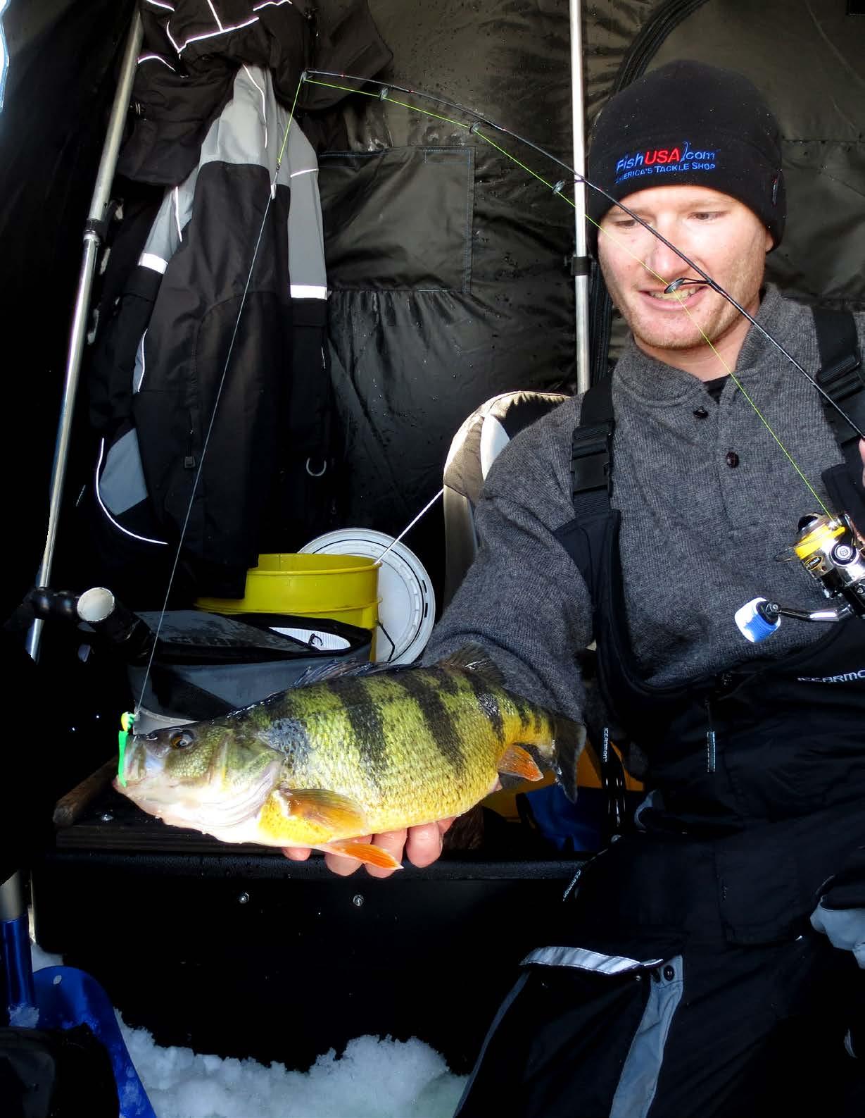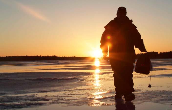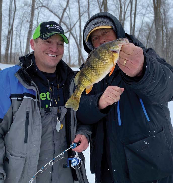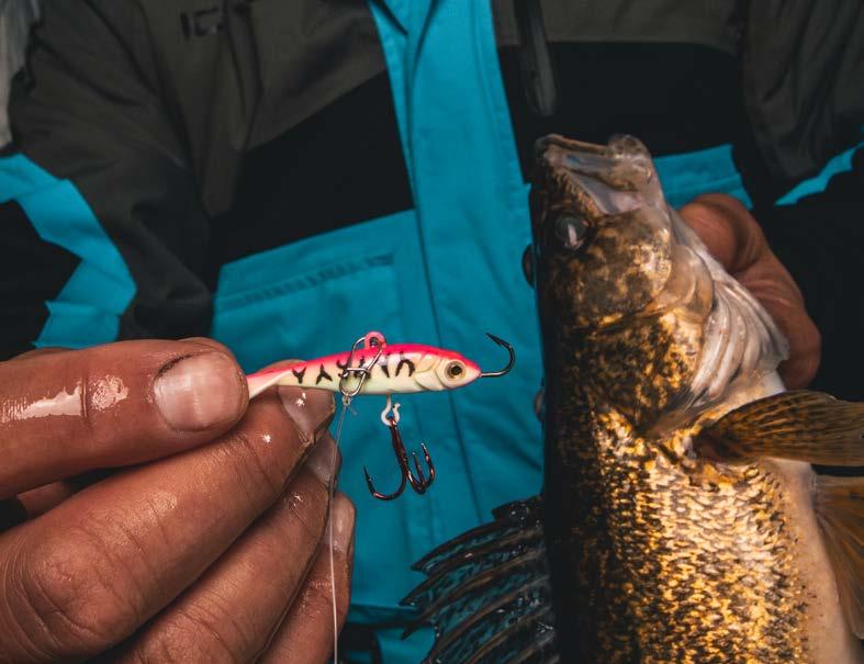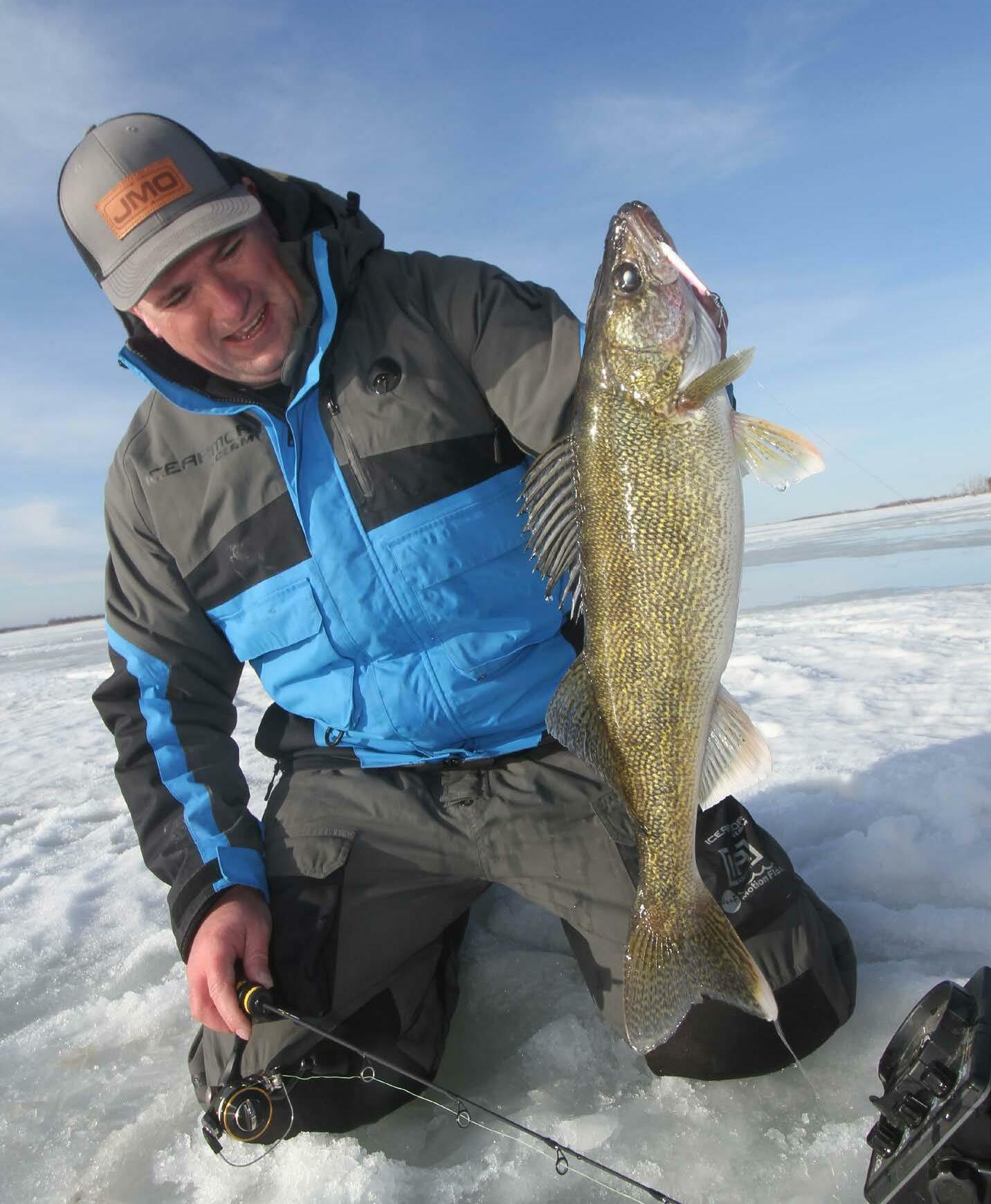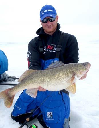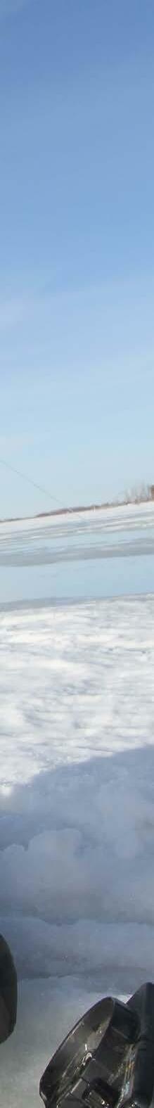 the ice several feet to the side of you. Landing big walleye through a hole in less than six inches of ice is tricky because the fish don’t turn and can sure back up easier. Reach your hand below the ice and pin them to the bottom of the ice. n