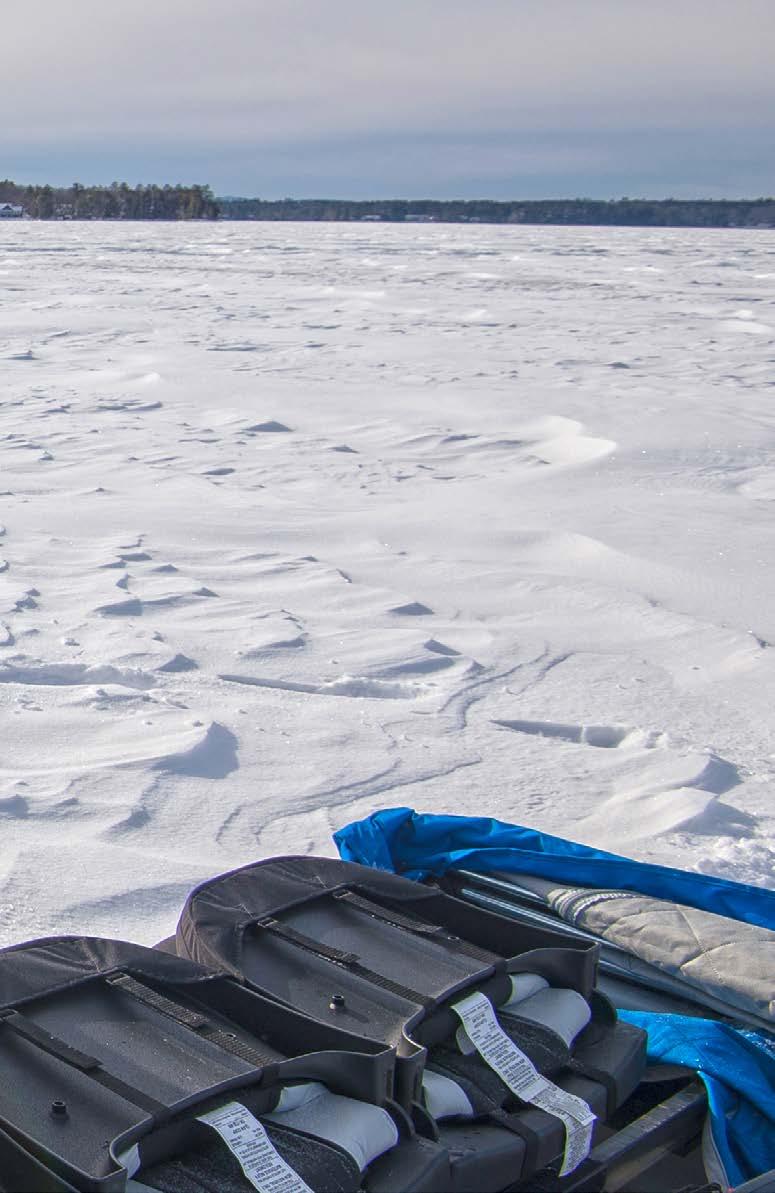 You hear a lot about efficiency in ice fishing circles. Efficiency and system are somewhat synonymous with one another. My system starts off the ice in how I store my rods, tackle and other gear. I use a double-sided rod locker to store the bulk of my rods. I keep it in my snowmobile trailer. This allows me to grab as few or as many as I want for the day. When I’m traveling on the ice, I use a singlesided rod locker. The single-sided case takes up less space, but still protects my rods. Regardless of the case, every one of my rods has a rod